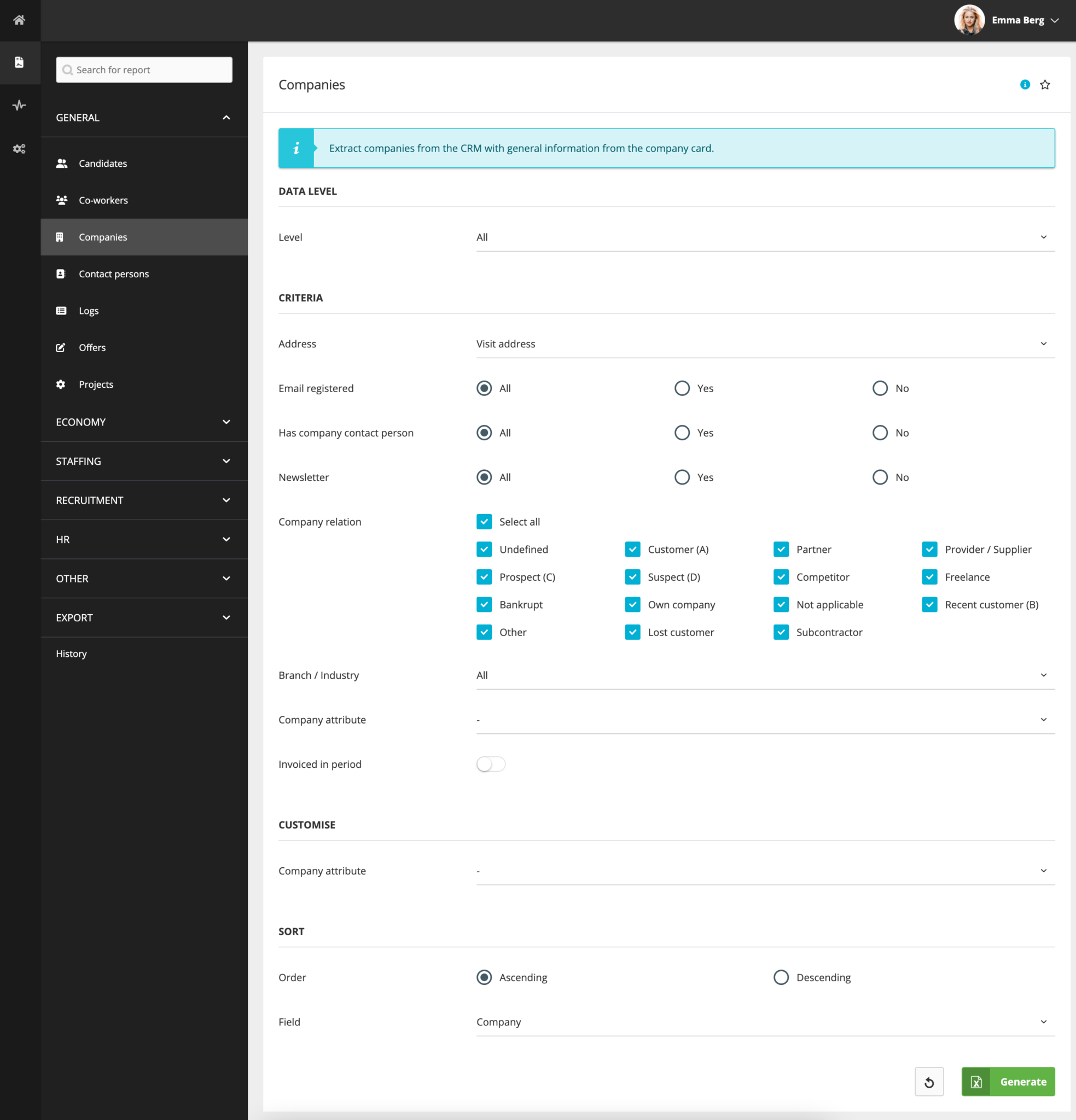 The permission for the Report center under Main areas (Menu) will give a user access to the report module, whereas the permissions for All reports, Corporation reports, Department reports, and My reports under Reports will limit the content of each report. Note that the "highest" level of permission will become the current access. The permission for Mailchimp will give the user access to the Mailchimp reports, which can be used to export contact information for candidates, companies, or contact persons. And the Report log will provide access to the History feature.