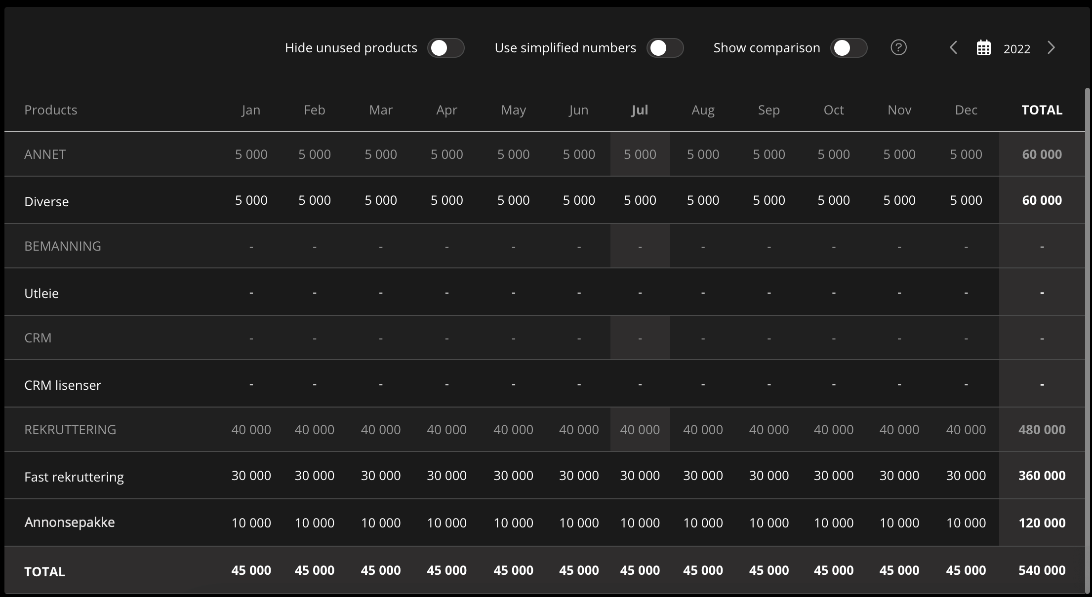 The budget can be defined individually for each month or input a default for the whole year. With the budget inputted, one can use the Hide unused products-slider to remove the rows without any data and/or Use simplified numbers for simpler viewing.