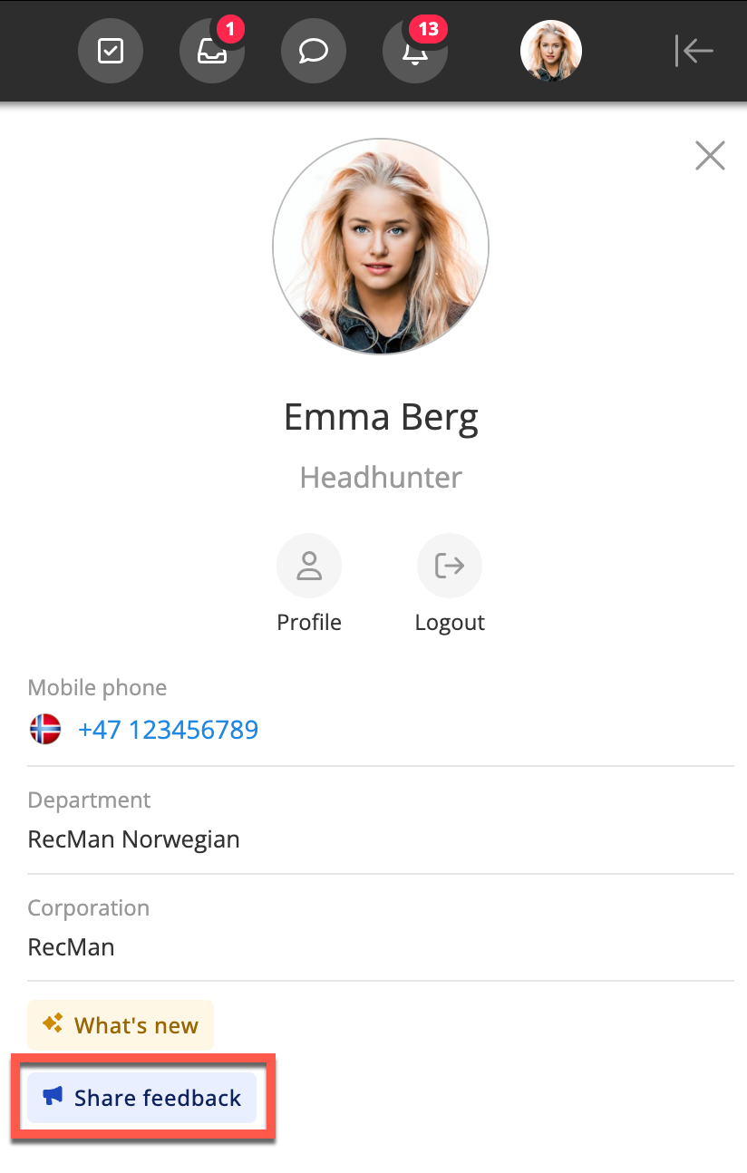 Another feature that lets you quickly send comments, report issues, or suggest improvements directly from within RecMan is through the Share feedback button, which appears after you click your profile picture.