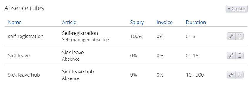 One or more absence rules can be built into a given salary and collective agreement. The purpose of this is to automate absence recording and achieve a degree of technical control. After you have added absence articles to the collective agreement, you will then be able to start building the rules. You can see an example of the articles included in the agreement below.