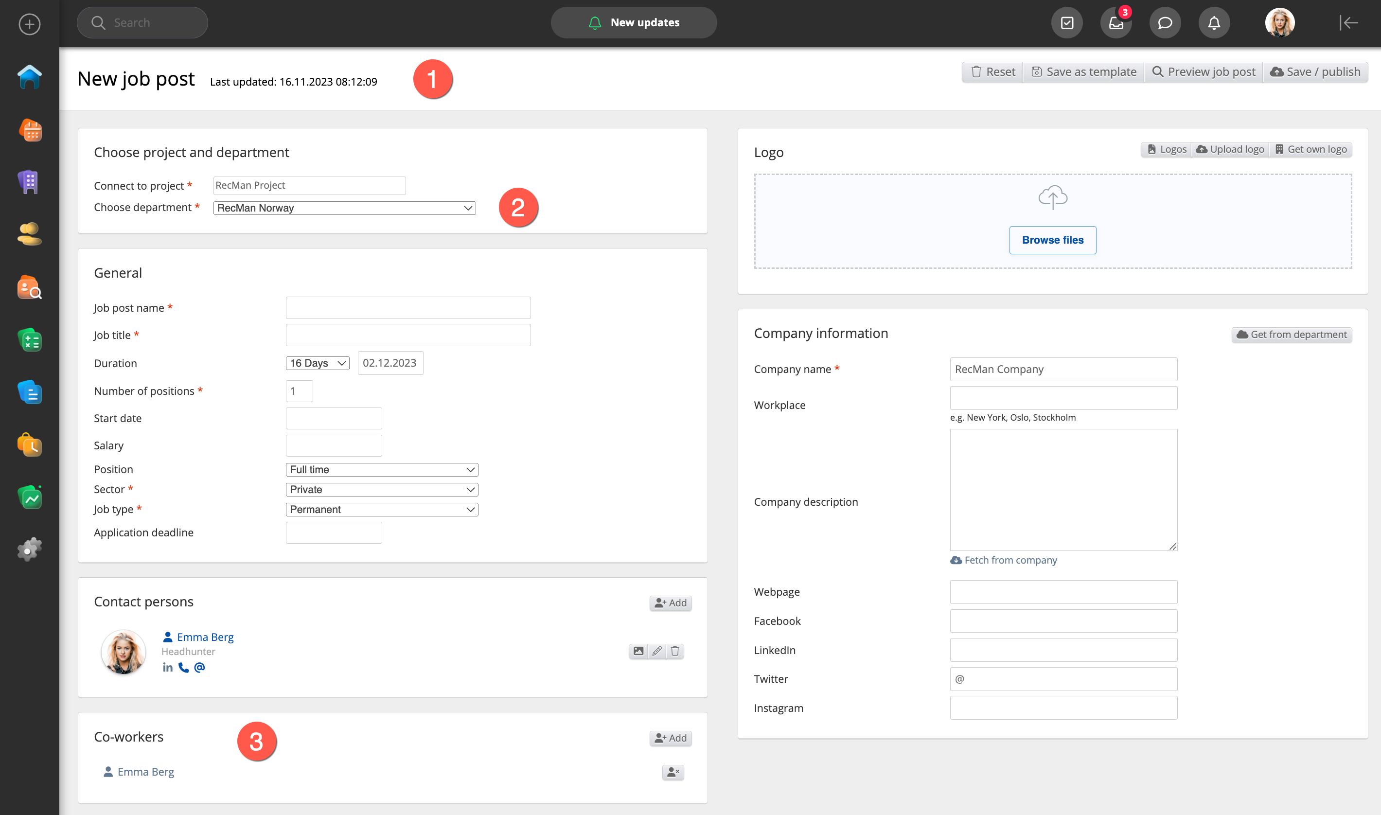 In case the user chooses a Co-worker data level, then Job posts that are connected to the chosen Co-worker will be counted in the widget (while creating a Job post, there is the possibility to connect this Job post to the specific Co-worker, so it will check the Job posts which are connected to a chosen Co-worker).