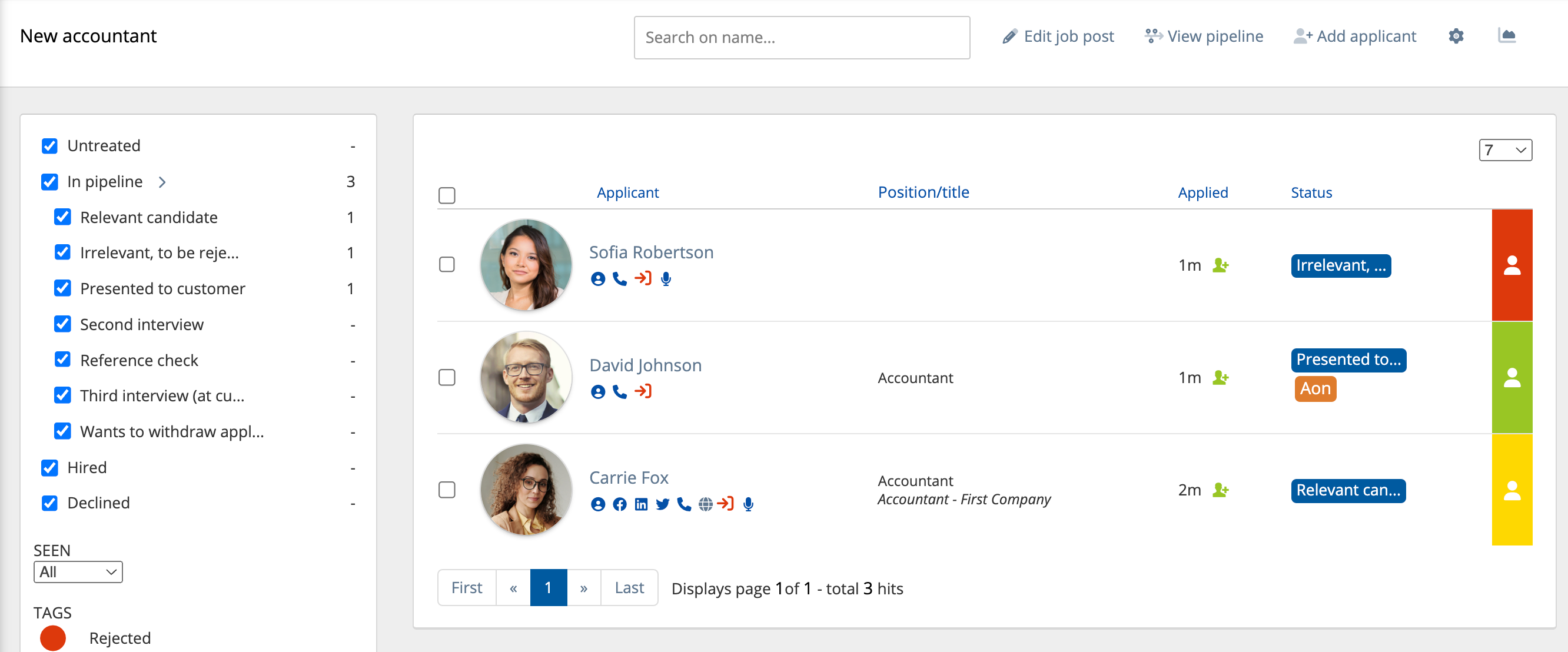 - Include (checkboxes) - Untreated, In process, Declined, Hired