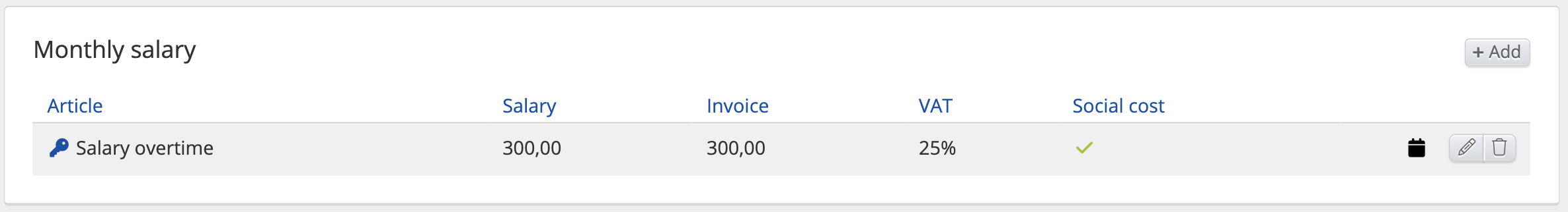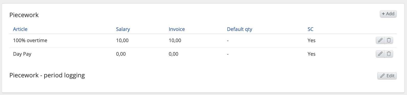 - Articles: Salary regular Normal hours, Absence, Additions, Deductions, Piecework, Day pay, Month pay, Overtime, Additions in time, Guarantee salary, Guarantee salary addition, Self-managed absence, Receipt