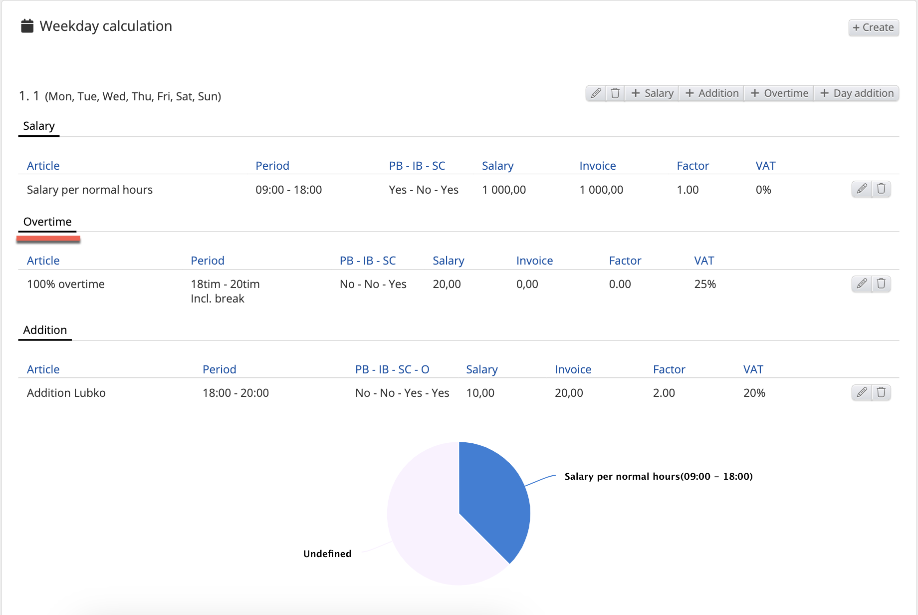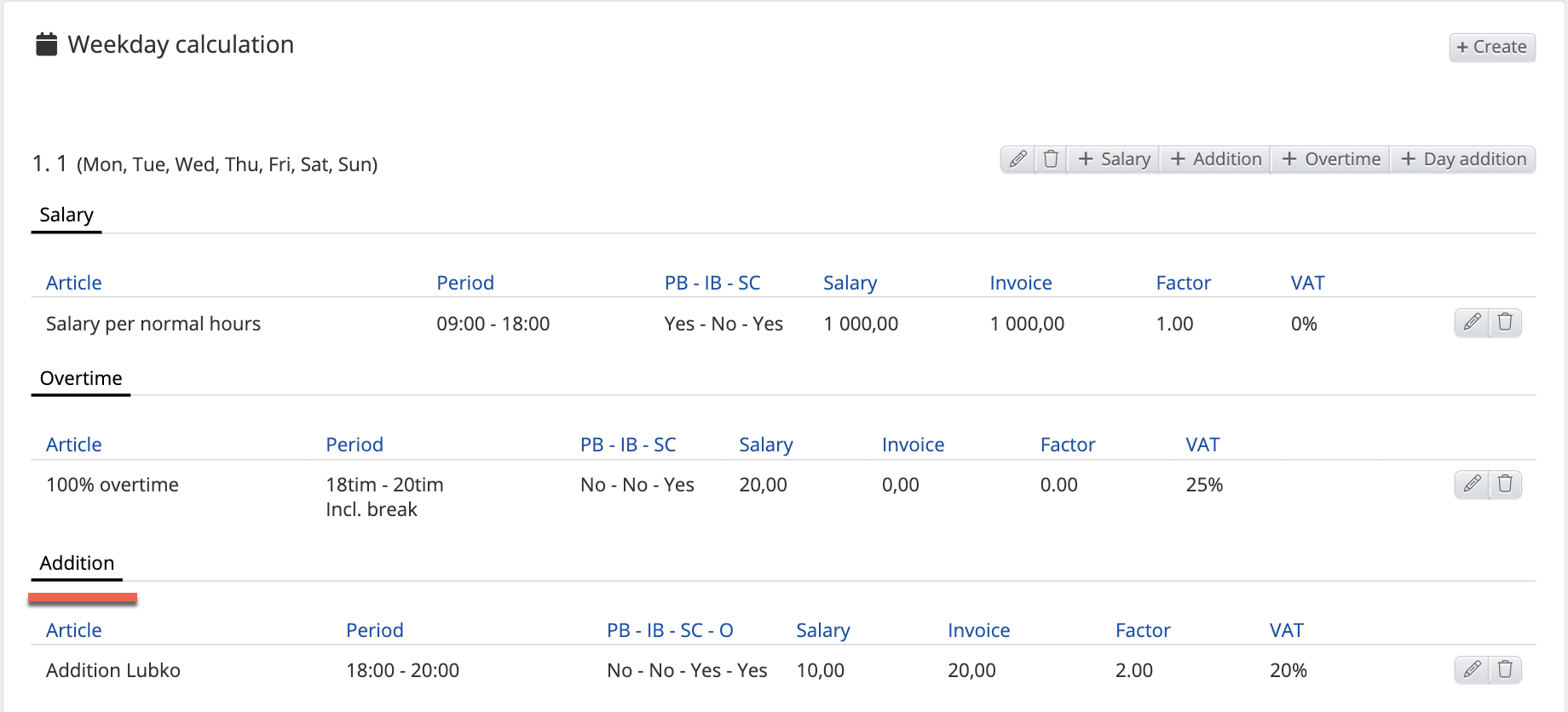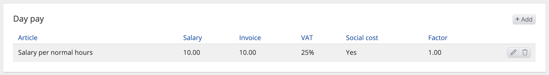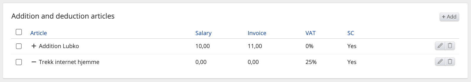 - Articles - Salary regular Normal hours, Absence, Additions, Deductions, Piecework, Day pay, Month pay, Overtime, Additions in time, Guarantee salary, Guarantee salary addition, Self-managed absence, Receipt