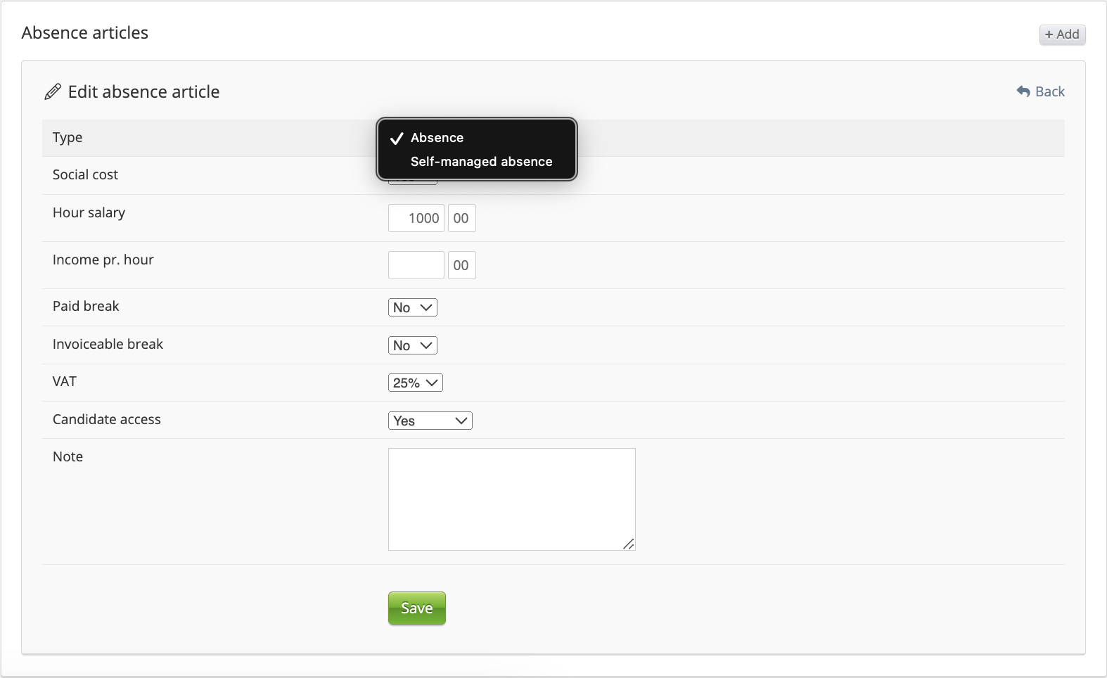 Absence can be set here. When absences are set, candidates will see these options and will be available to log them. Users can also set the type of absence – simple absence or self-managed.