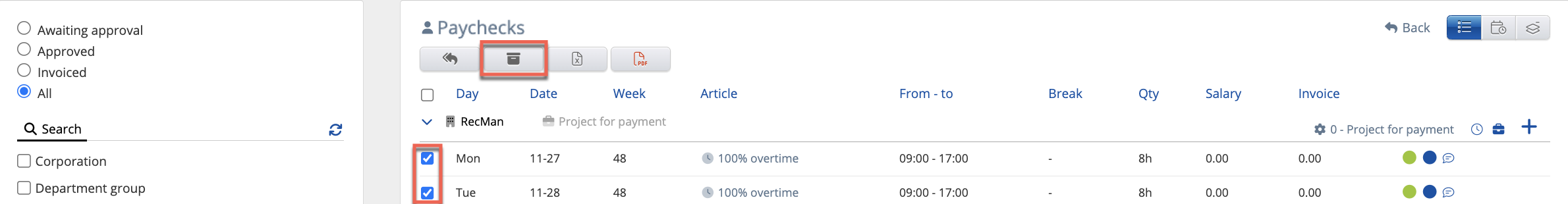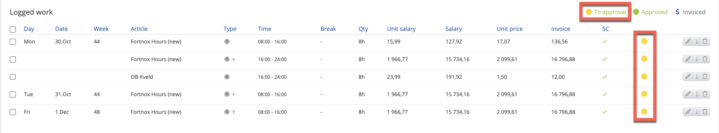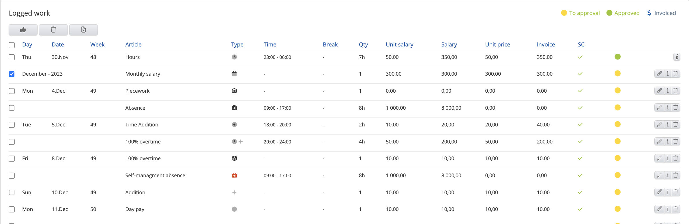 - Status work checkboxes - To approval, Approved, Salaried.