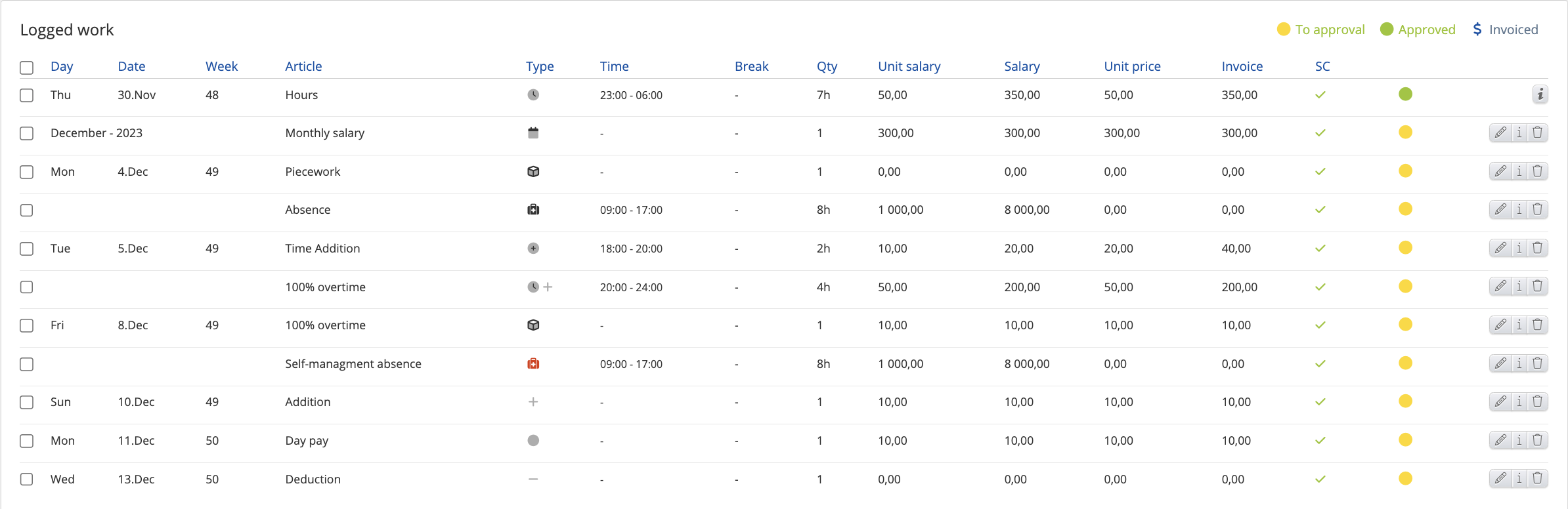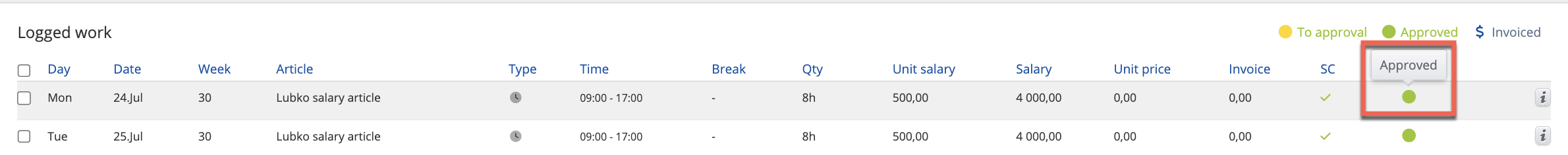 Approved work is shown with a status icon - “Approved” and “Salary paid.” After this step, the admin can prepare an invoice and pay the salary for currently registered work.
