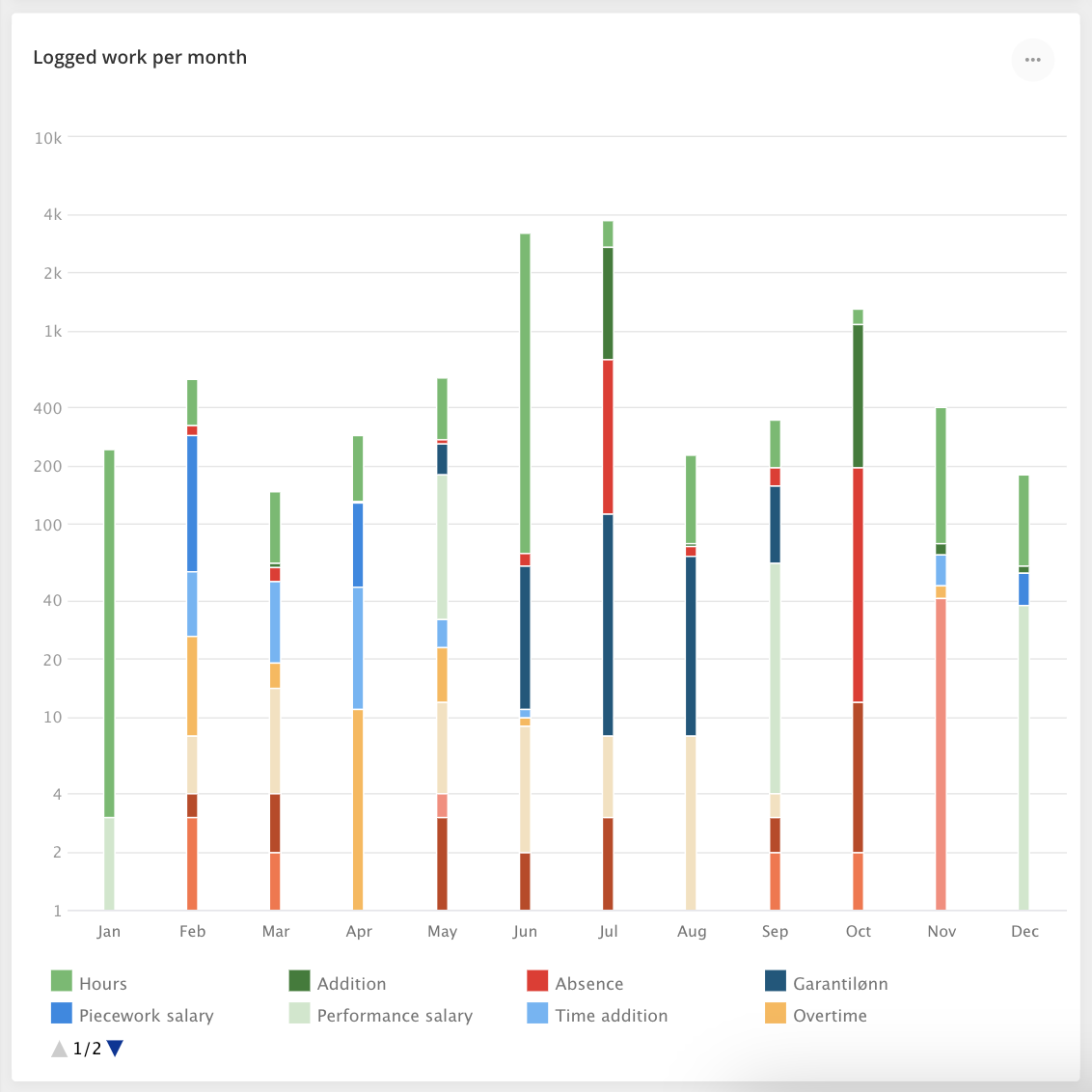 This widget shows logged work by employees with different article types and shows data for a year by month from January to December. Logged each article by employees present on the widgets as quantity of each article (logged one article for one day will be present as “1” value on the widget chart) and total number in each month logged by every employee added to the selected project, all articles have their own color. Article types are: Salary, Absence, Addition, Deduction, Piecework salary, Day pay, Month pay, Overtime, Timebased addition, Guarantee salary, Guarantee salary addition, Self managed absence, Receipt.