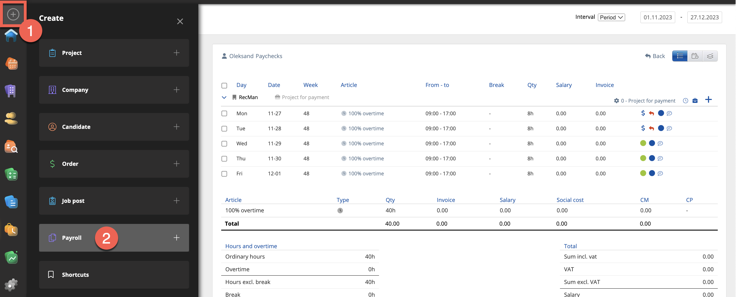 After marking it as invoiced, the admin can create Payroll. To do that, navigate to the Plus button and select Payroll.