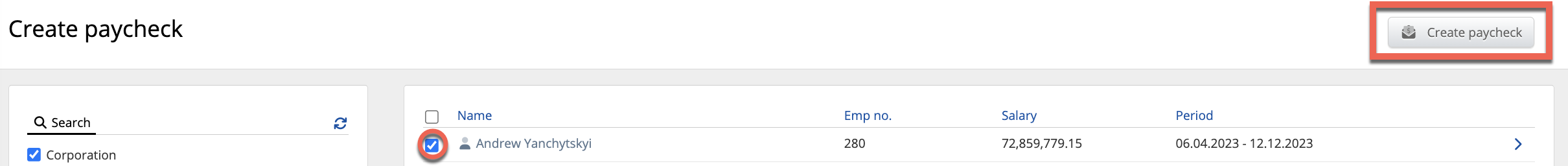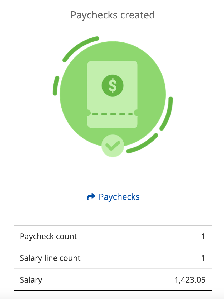 On the Payroll page, mark the checkbox for new registered and invoiced work, click on the Create paycheck button, and a screen with successful action will be shown with the message Paychecks created.