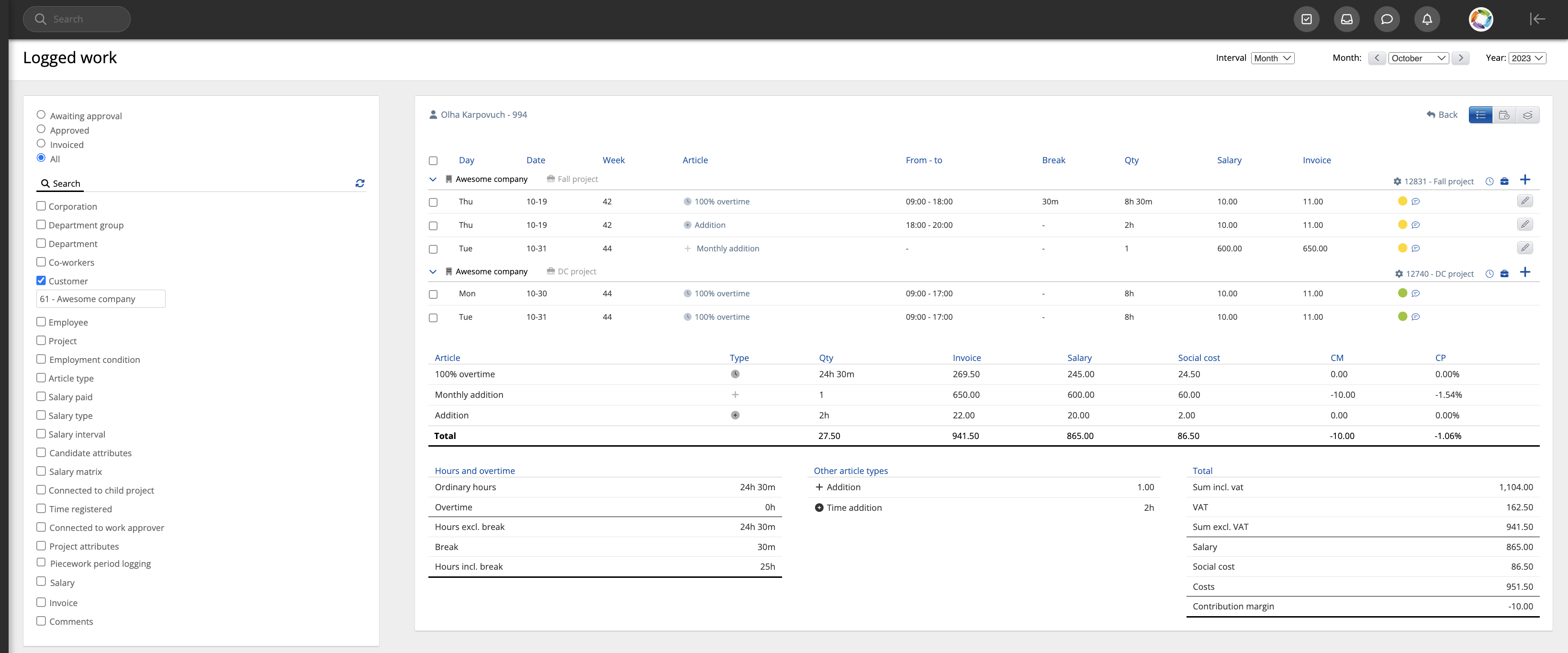 The widget shows logged work with total salary and invoice values per company.