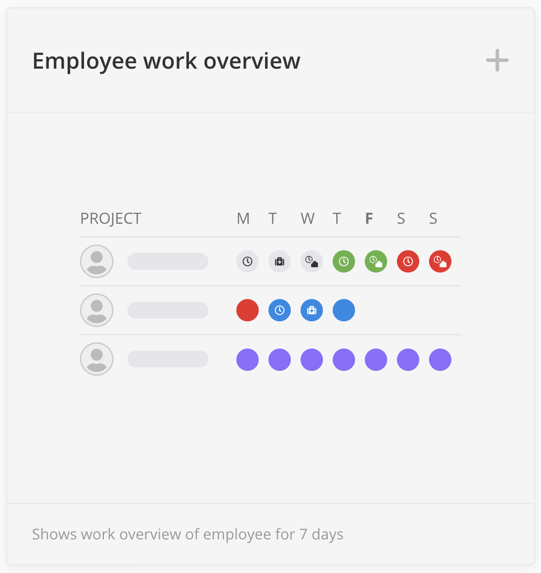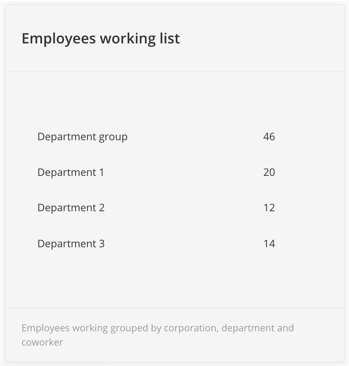 This widget shows employees who are working according to the period of time set in the widget settings. In the widget settings, the user can choose work status - Job, Shift or Work week.