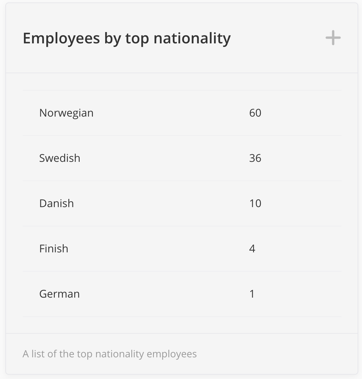 This widget shows employees grouped by nationality. The biggest number is shown at the top of the list.