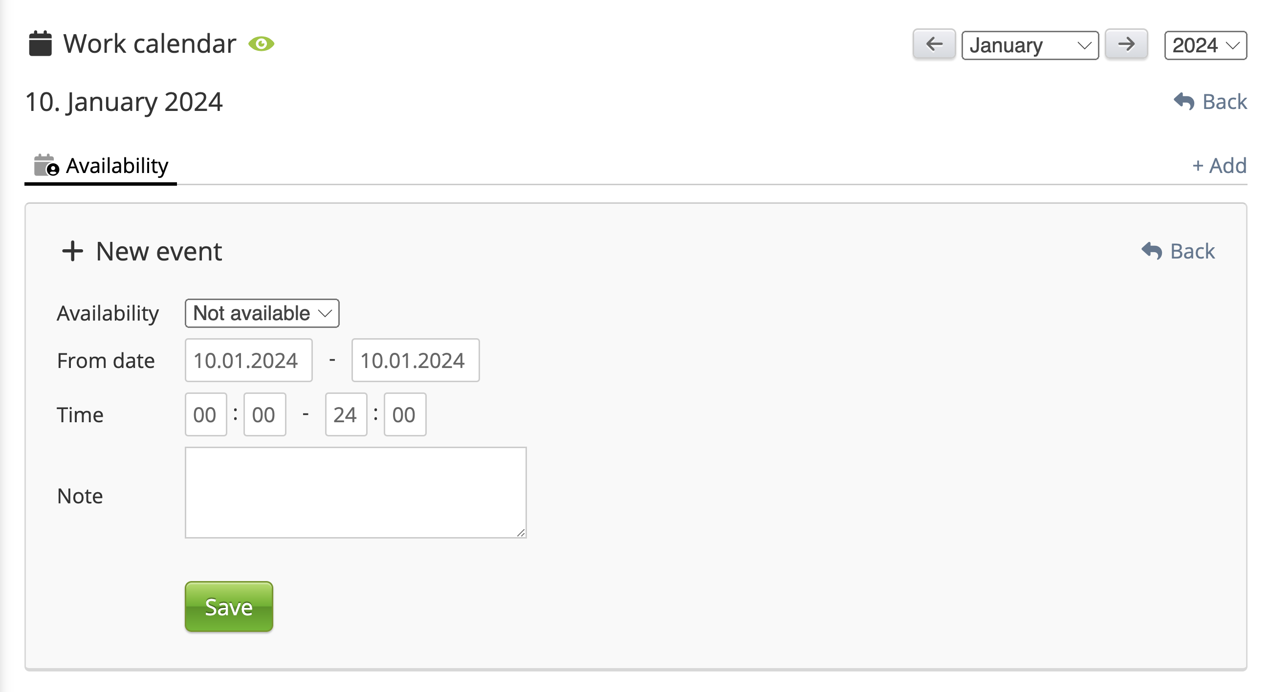 Unavailable (not availability) can be set from the ‘Work calendar’ of the employee while adding ‘Availability’ for the employee. The user can choose the Unavailable type of availability and the date and time of unavailability.