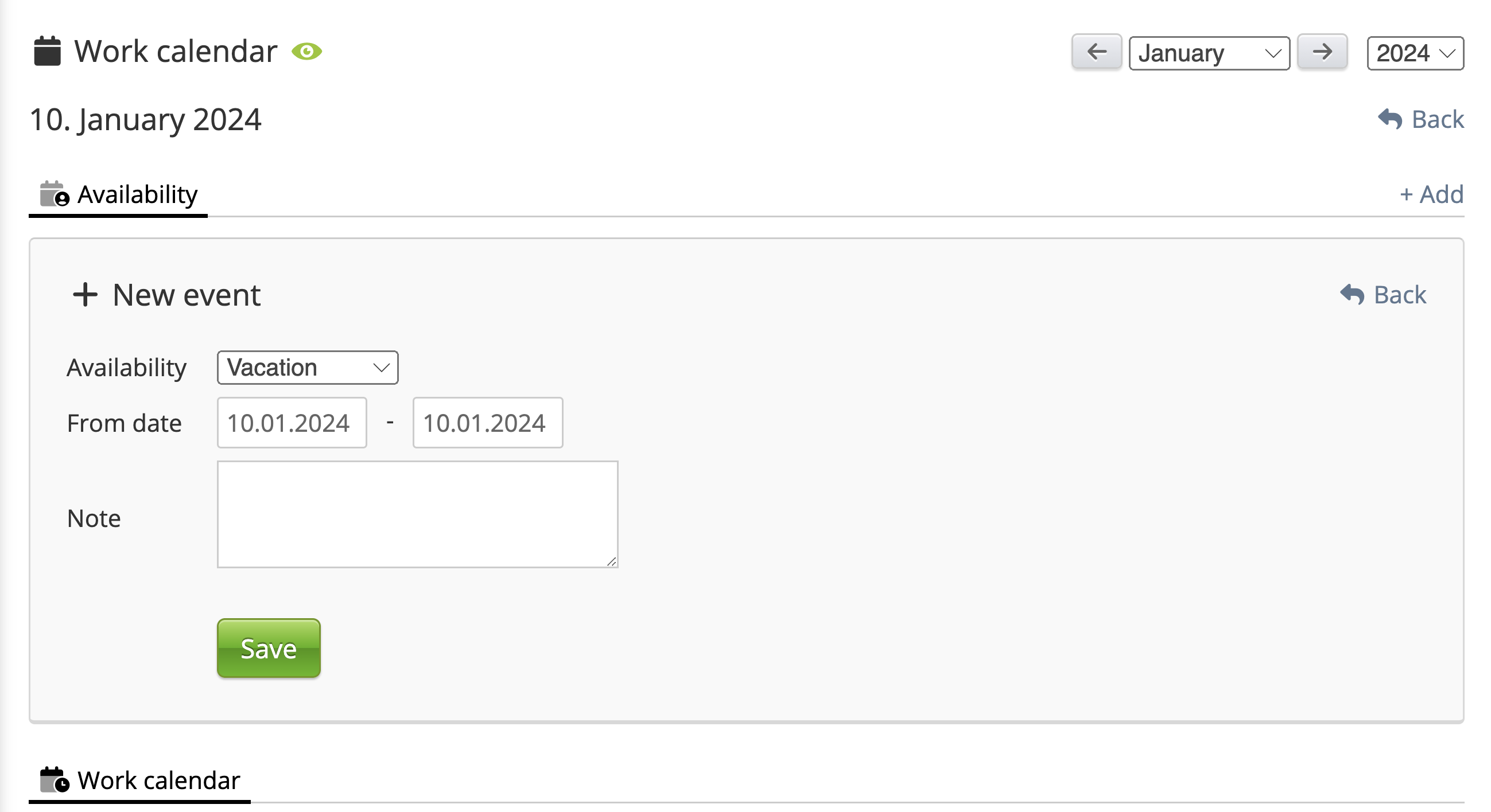 Vacation can be set from the ‘Work calendar’ of the employee while adding ‘Availability’ for the employee. The user can choose the Vacation type of availability and date of vacation.