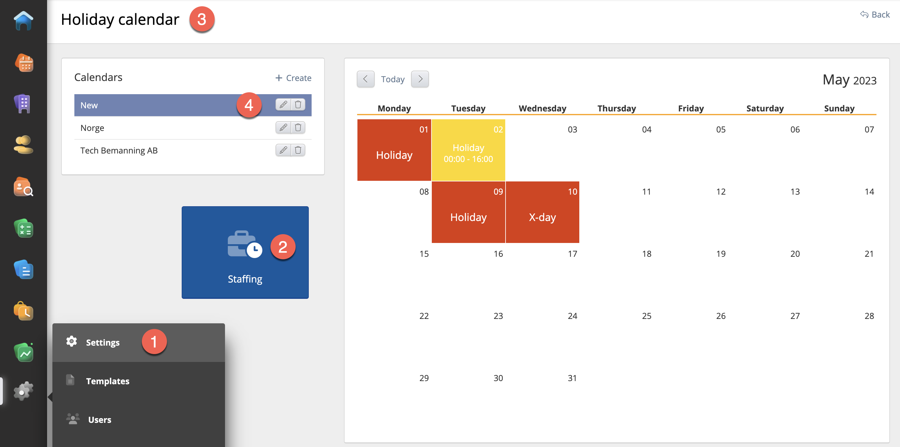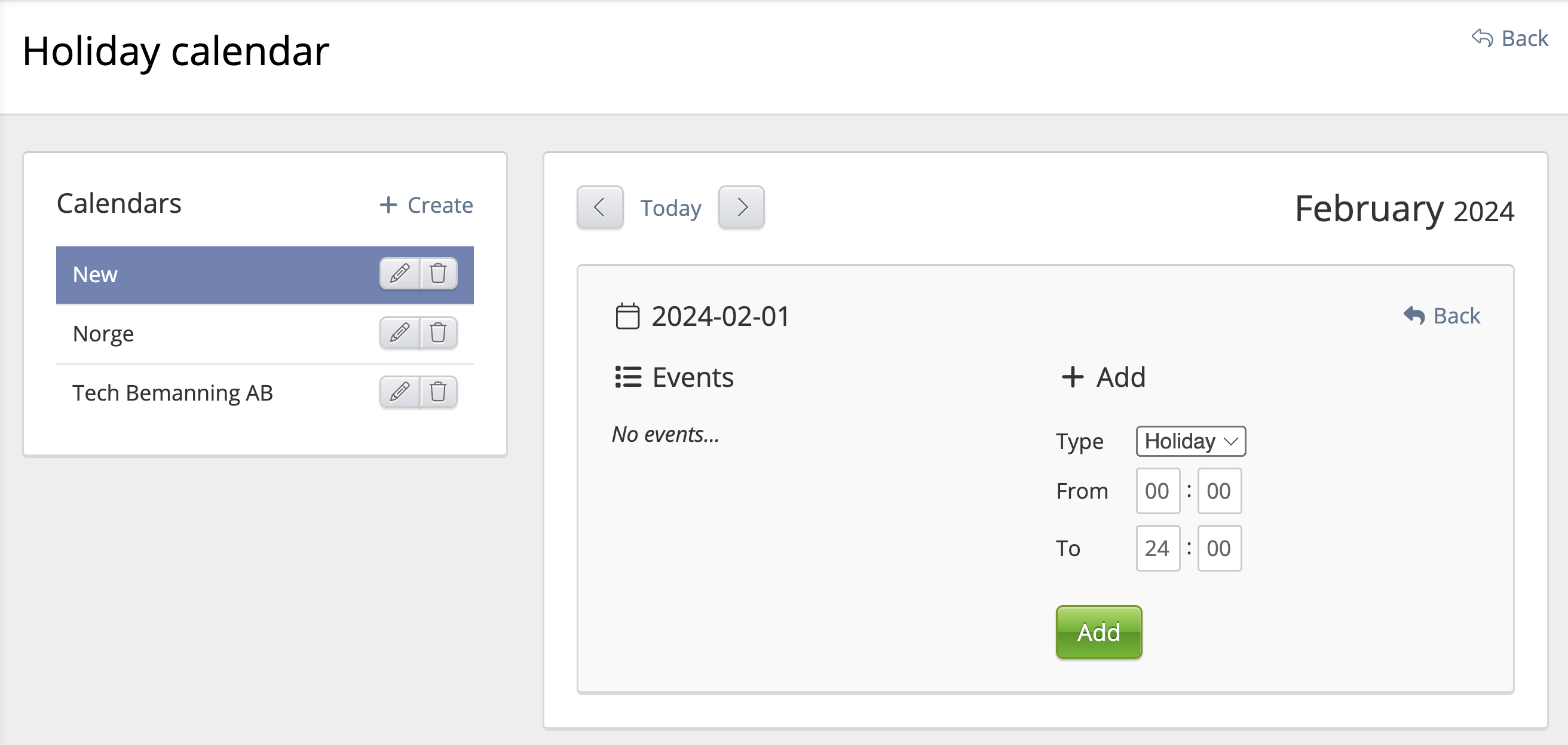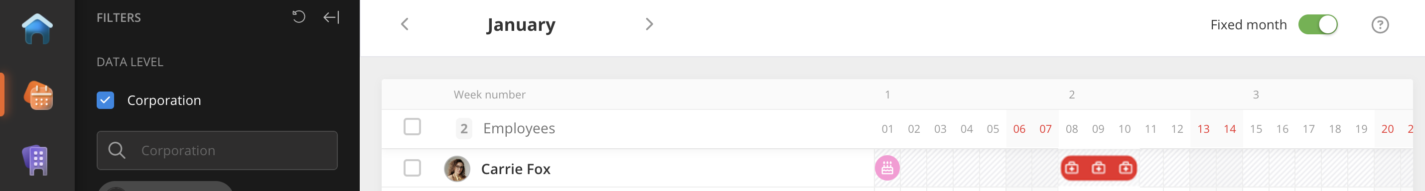- Type (type of absent): Vacation, Leave of absence, National holiday, Self-managed and Unavailable