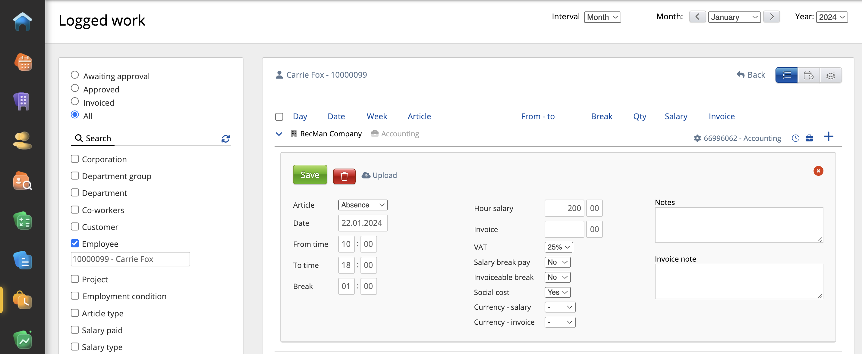The absent employee is shown in the Employee calendar and Logged work page( ability to add or edit the absence employee settings):