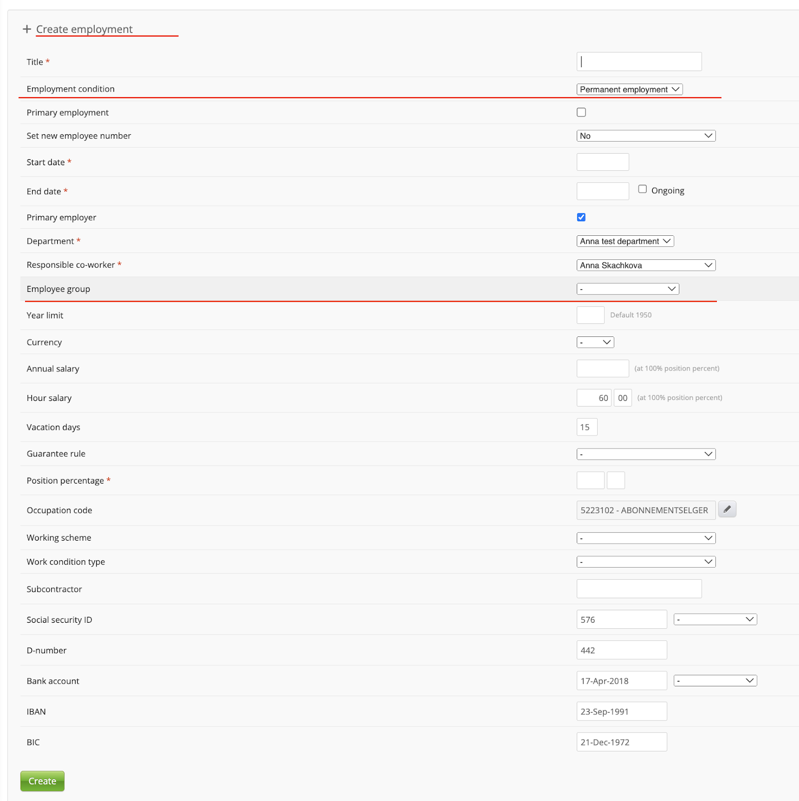The user can set the Employee group and Employment condition while creating/editing employment from the Candidate card in the RecMan: