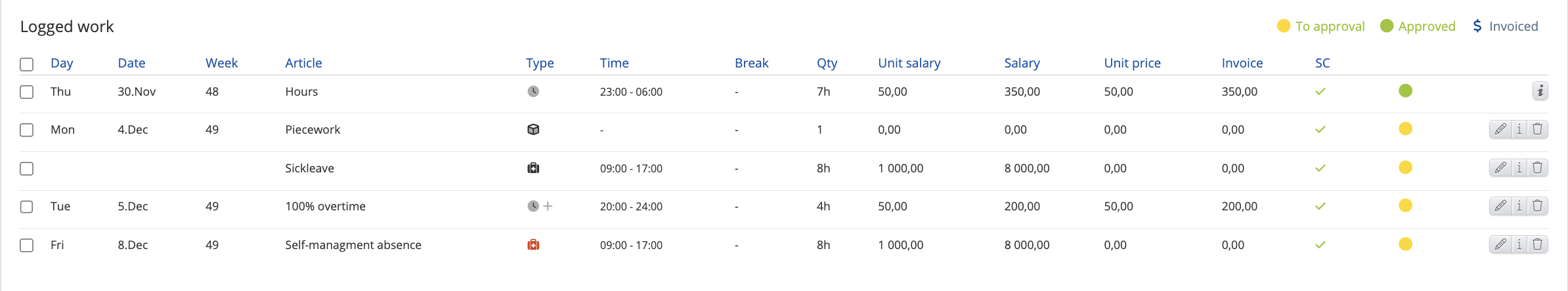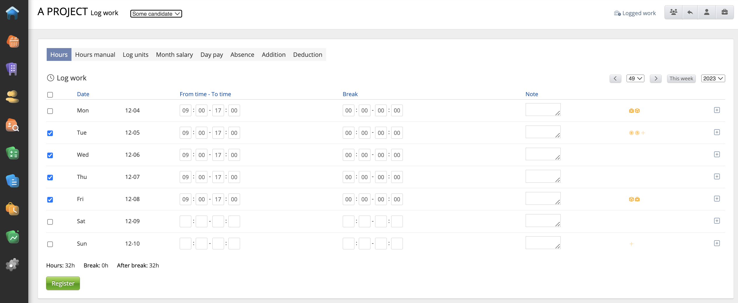 Candidates can log different work types. The widget will show data according to widget settings - Hours, Overtime, Absence, Piecework and Self-managed absence.