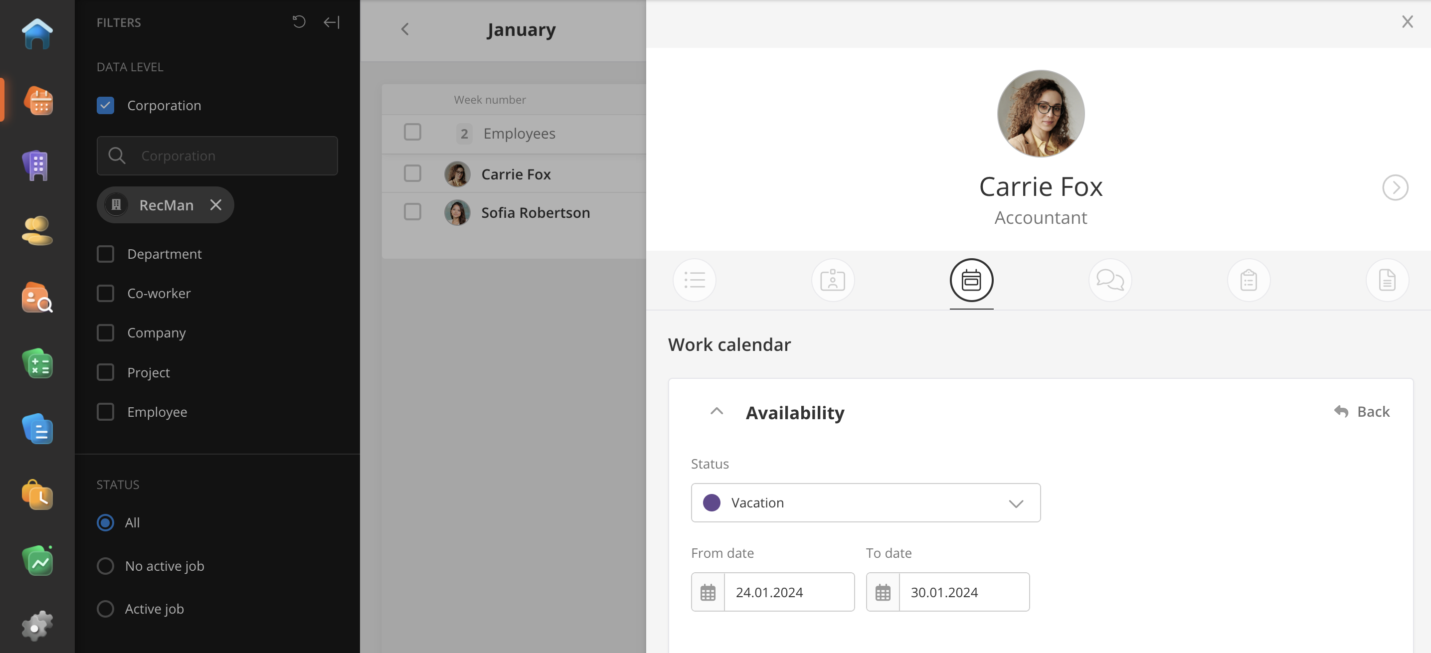In case the user chooses the Corporation data level, then employees will be counted according to the department of the user who is responsible for a Job. This department is connected to some particular corporation. For example, User 1 is connected to Department 1, and this department is connected to Corporation 1. In case the user chooses Corporation 1 from widget settings, then employees will be counted from the job with User 1 as a responsible co-worker.