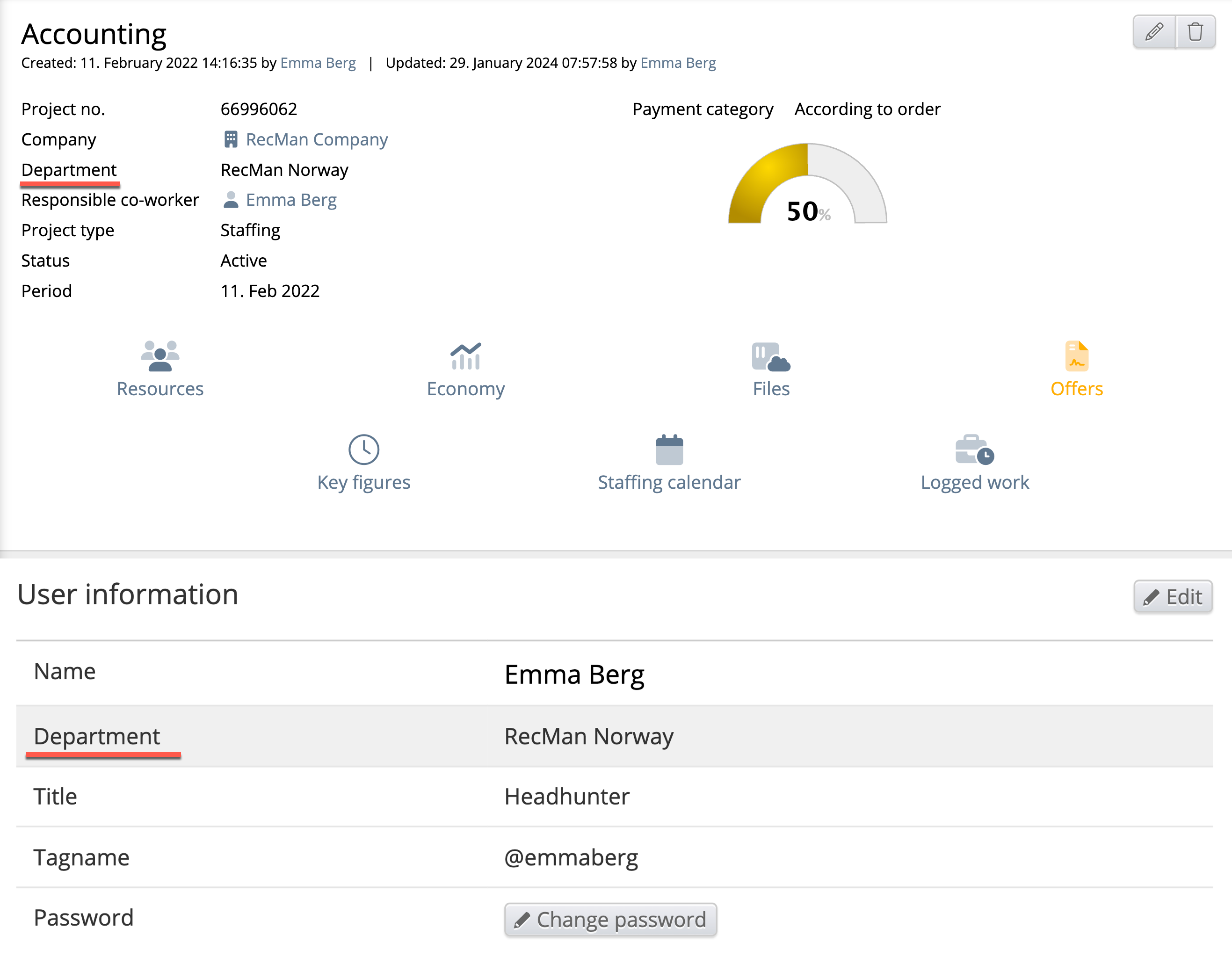 The Logged hours widget shows logged hours. In Recman, the admin can add some Jobs to the Project. Candidates can log hours from this work. In the widget settings, a few work types are present - Hours, Overtime, Piecework, Absence and Self-managed absence, according to the article type. The widget also shows a comparison percentage from the compared period.