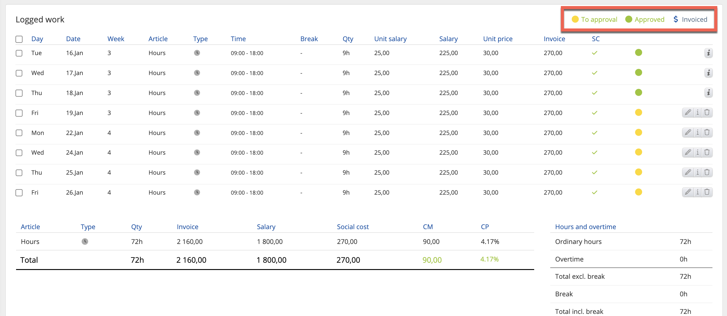 In case the user chooses only the ’To approval’ checkbox, then the salary value will be counted only for work that is waiting for approval.