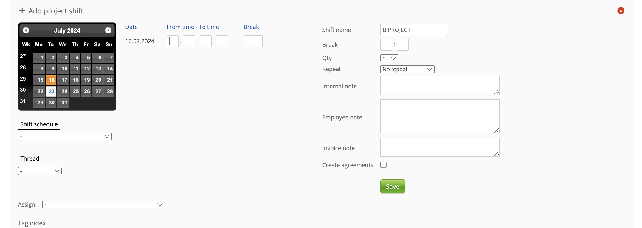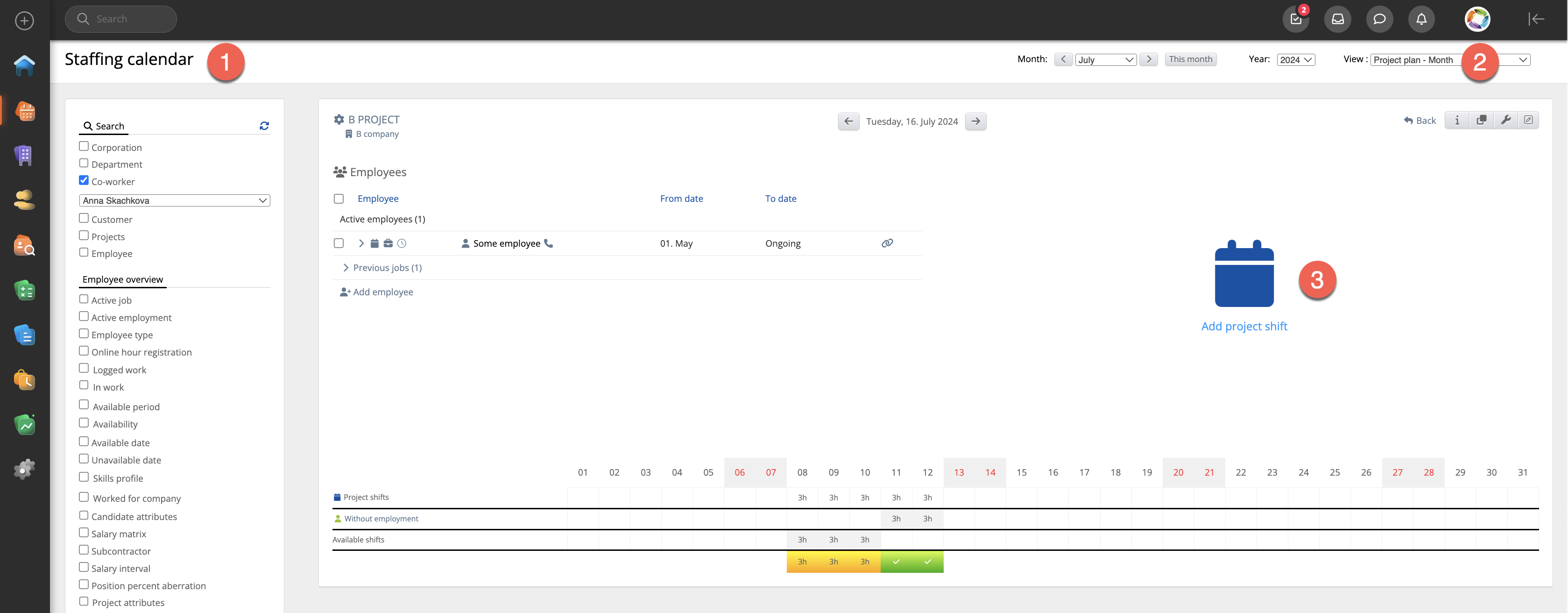 The user can set the Shift from the Staffing calendar (View - Project plan/ Month) in RecMan: