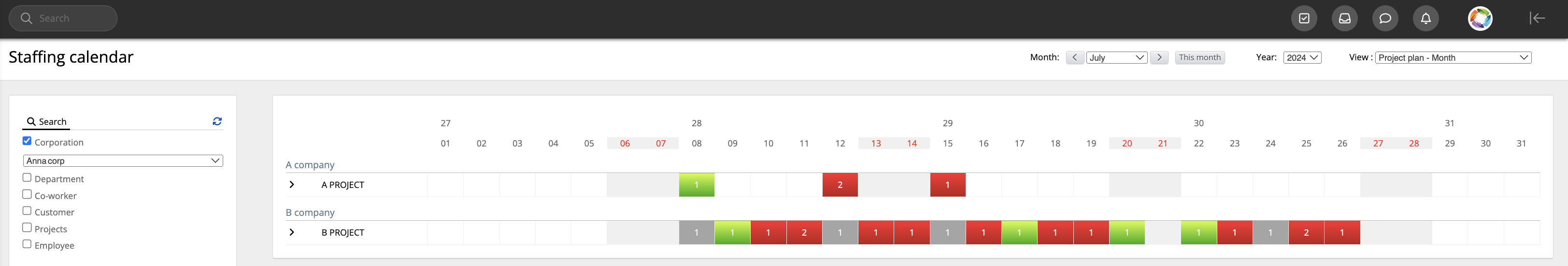 In case the user chooses the Corporation data level, then Jobs will be counted according to departments connected to projects with Jobs. For example, there are 2 Projects with Jobs. Project 1 is connected to Department 1, and Project 2 is connected to Department 2. Department 1 and 2 are connected to Corporation 1. After choosing Corporation 1 from widget settings, 2 Jobs will be shown in case they expire in a set period of time.