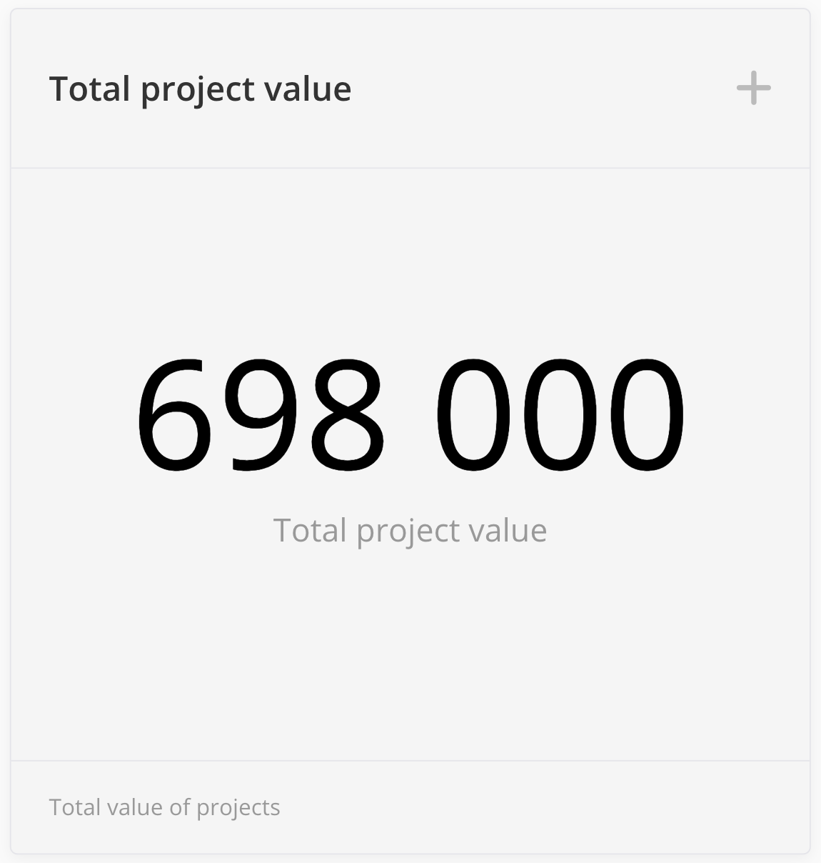 This widget shows the total project value according to widget settings. While creating a project, the user can set some value for this project. In the widget settings, the user can choose the type and phase of projects. Also, the user can choose from which projects value will be fetched - with an end date or ongoing.