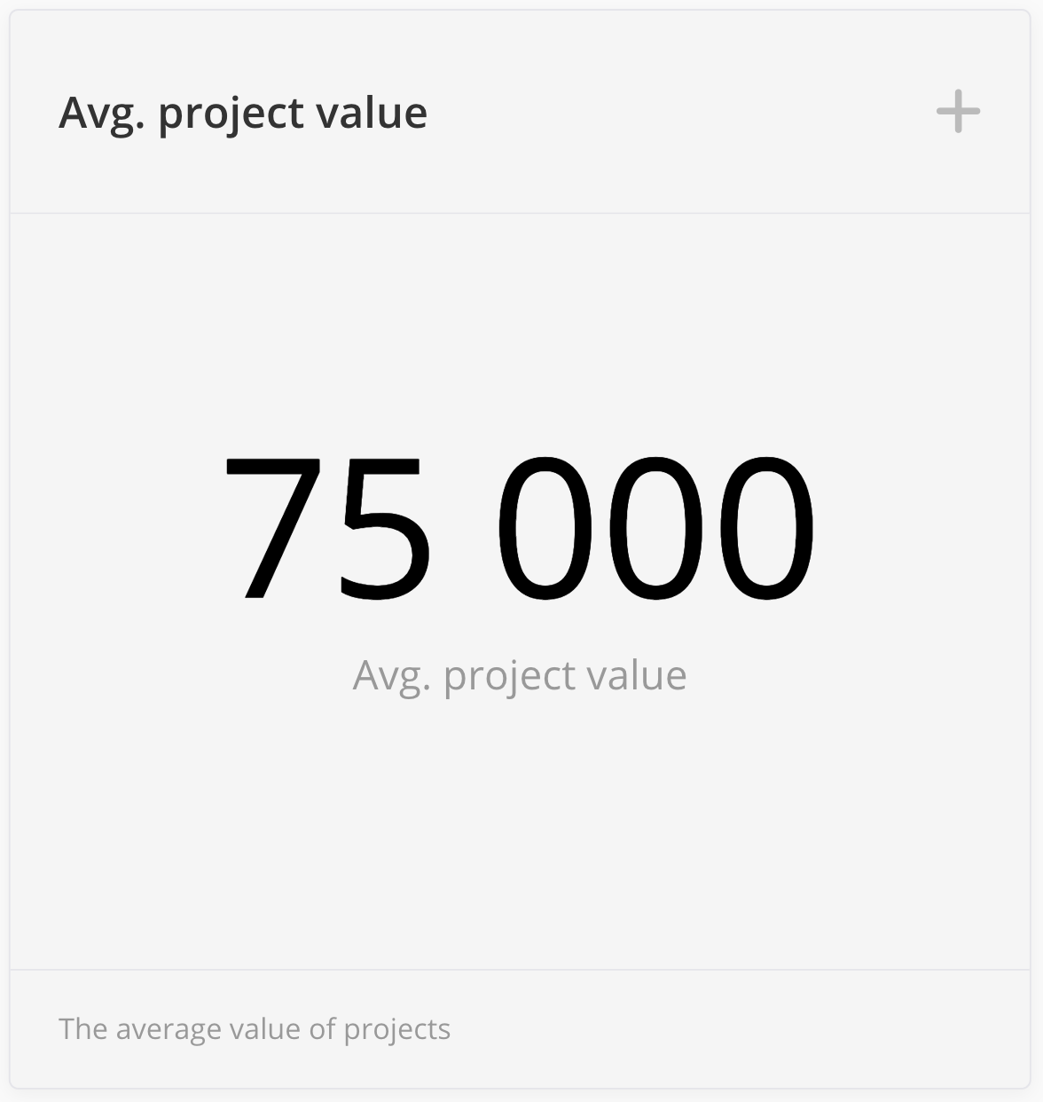 This widget shows the average project value according to widget settings. While creating a project, the user can set some value for this project. In the widget settings, the user can choose the phase and type of projects. Also, the user can choose from which projects value will be fetched - with an end date or ongoing. This widget is pretty similar to the Total project value widget. The only difference is that this widget shows the average value of the projects. Also, projects without value are counted in the calculation, for example, Project 1 has 40 value, Project 2 has 50 value, and Project 3 has 0 value, then the widget will show 30 ((40+50+0)/3 = 30). Data is fetched the same way as the Total project value widget.