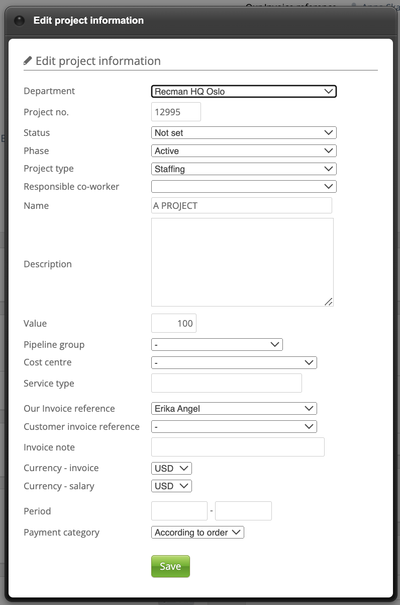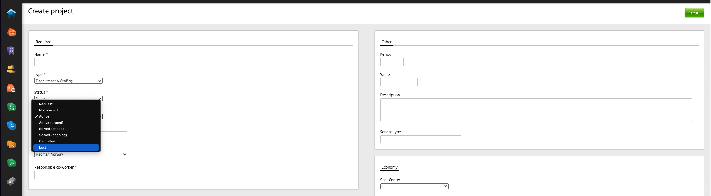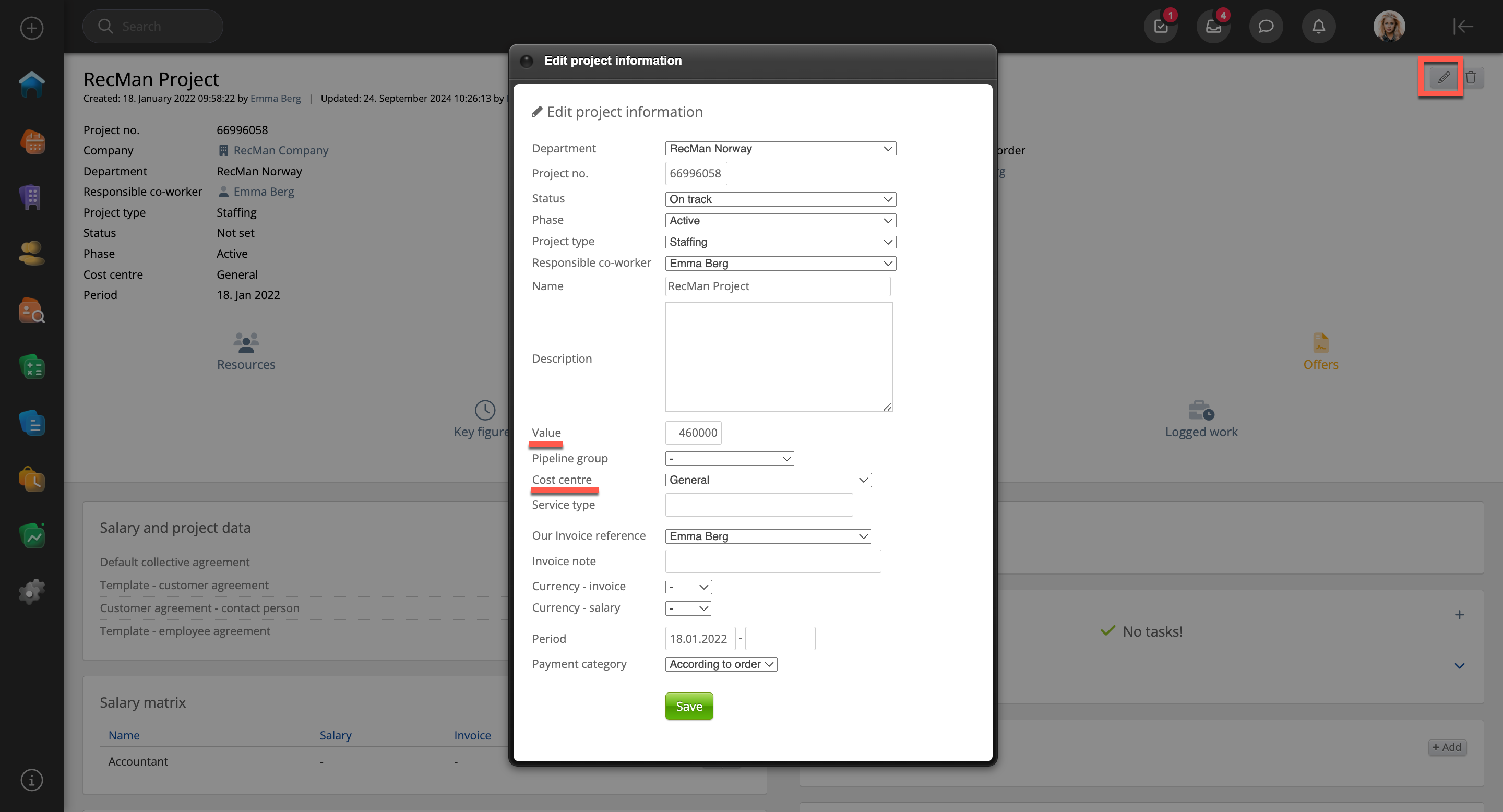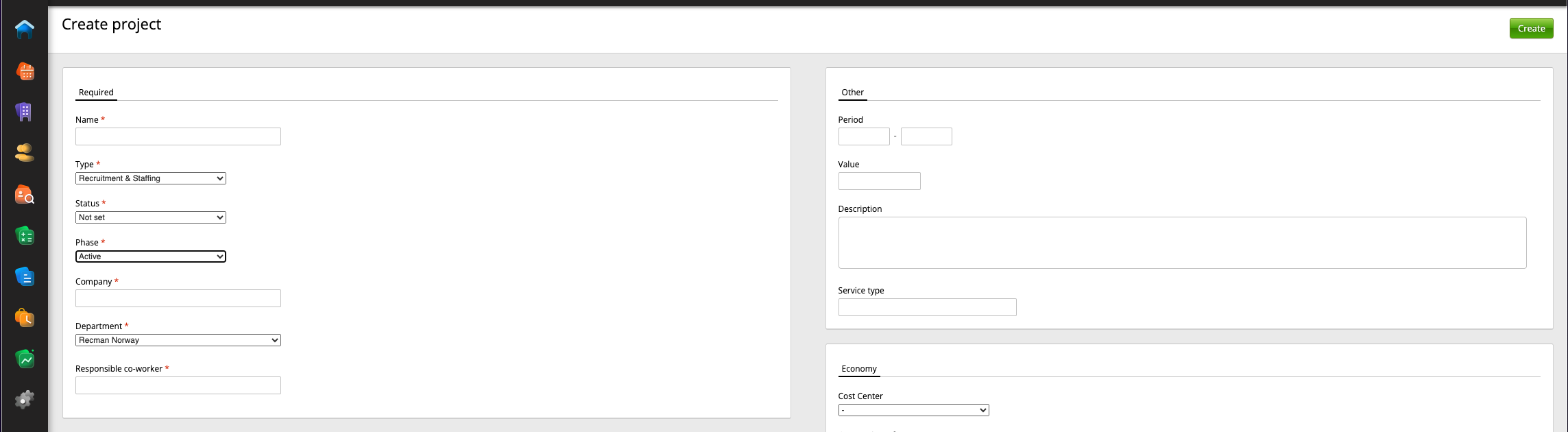The user can set the necessary settings of projects (value, cost center, and others) on the Project card page in RecMan: