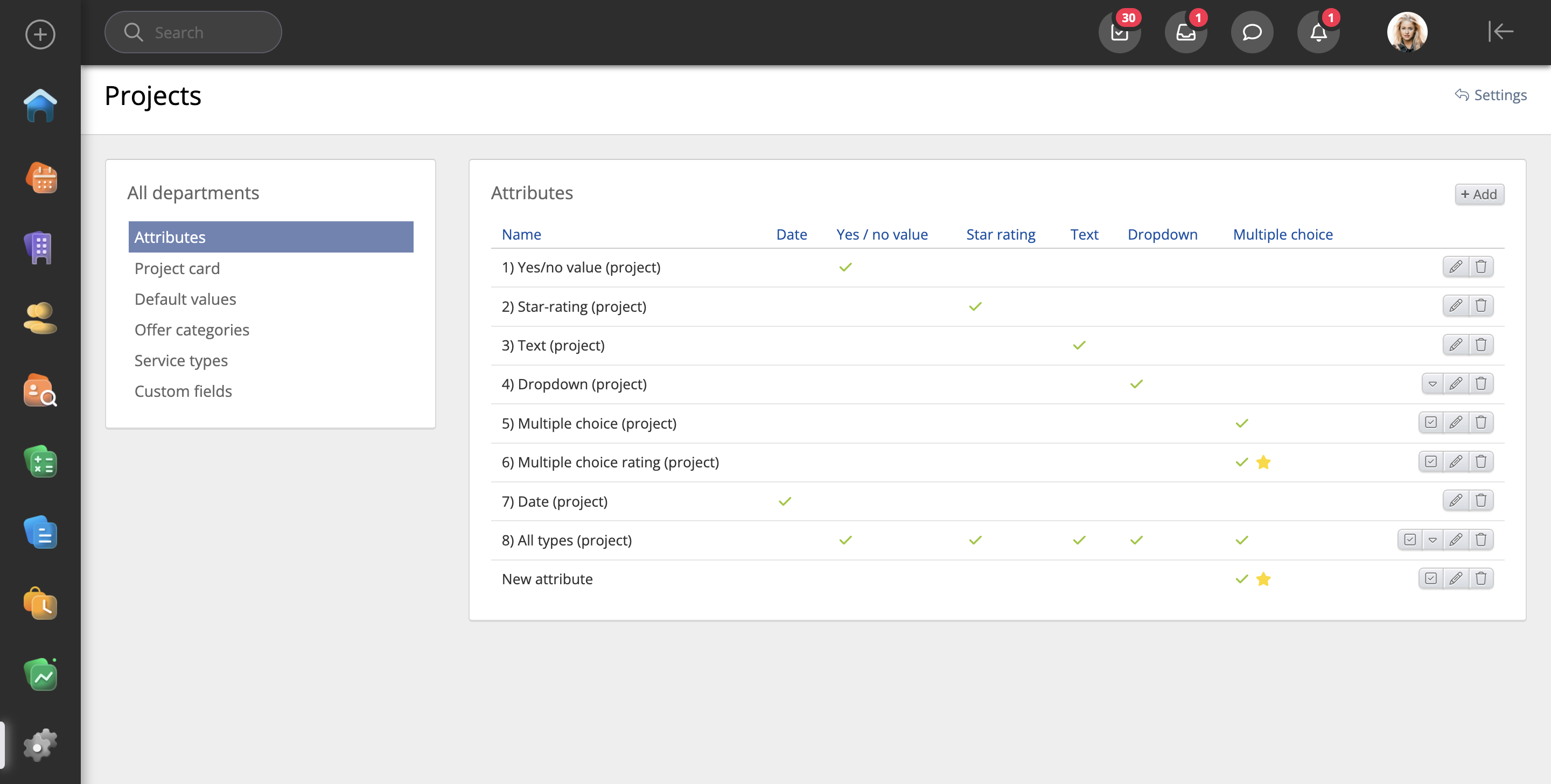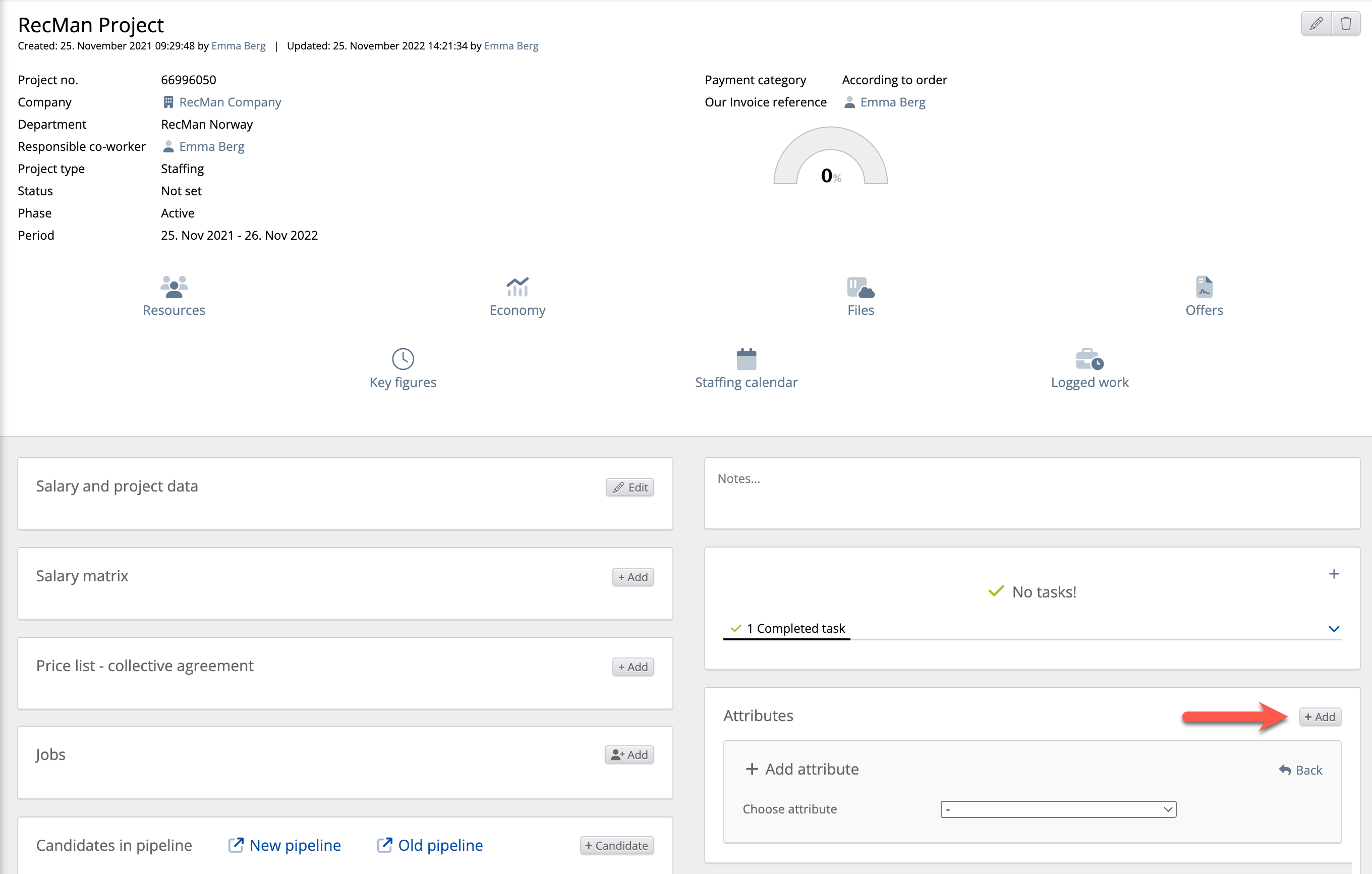 - ‘Project attributes’ section: drop-down list. This section includes all project attributes from RecMan)
