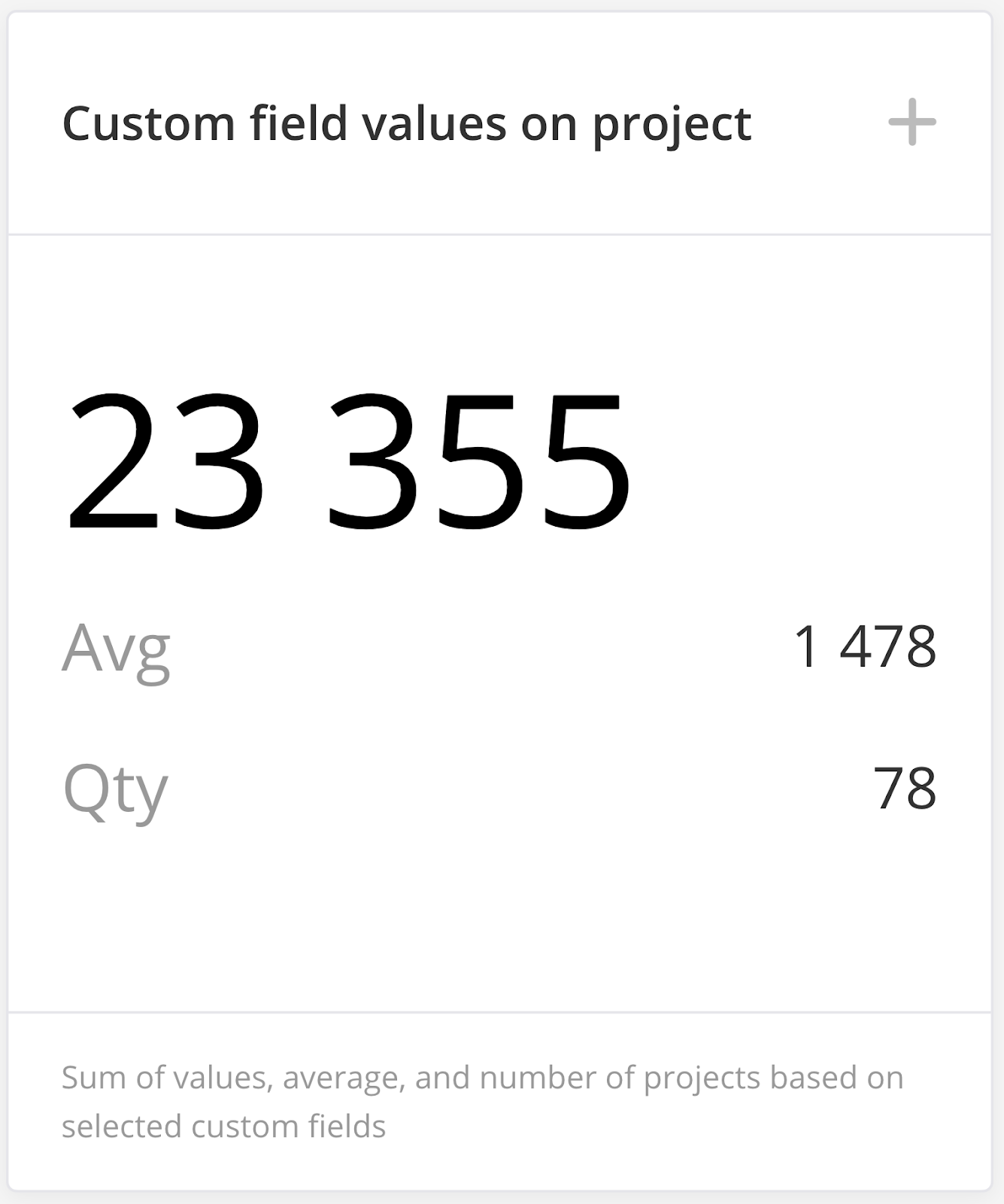 The widget summarises the values, shows the average value, and displays the number of projects with selected custom fields. The widget supports Custom fields for calculation only of Number and Money types.