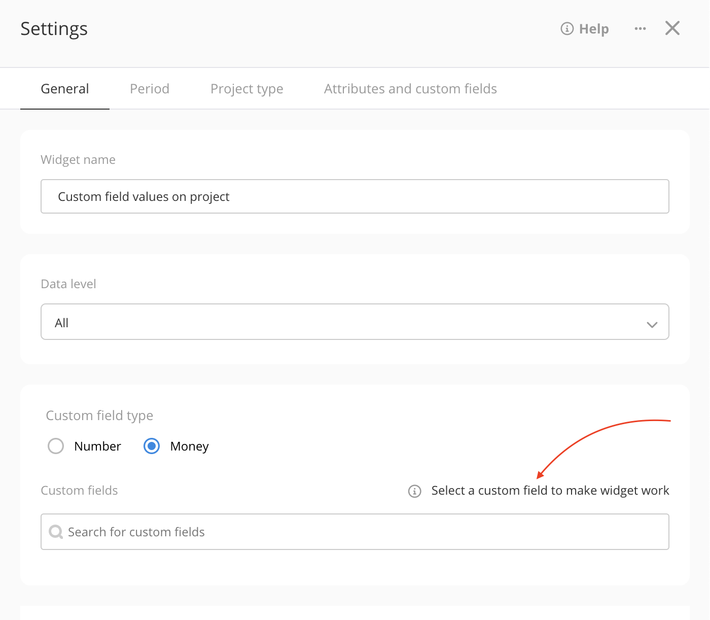 When a user opens settings, an info message about the Custom field selection (“Select a custom field to make widget work”) appears. The info message is closed automatically when the Custom field is added.