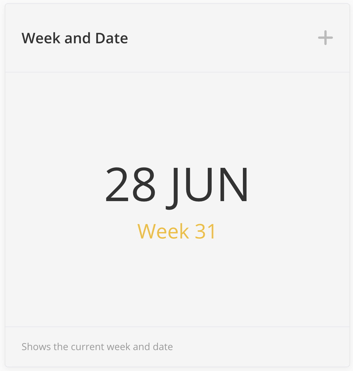 The Week and Date widget shows the current week and date according to widget settings. In the widget settings, the user can choose the Time zone according to which week and date will be shown. Also, the user can choose what will be shown on the widget - only a week or only a date. In the widget settings, the user can also enable the Display widget name toggle. After enabling this toggle, the title of the widget will be shown, and the user can name this widget.