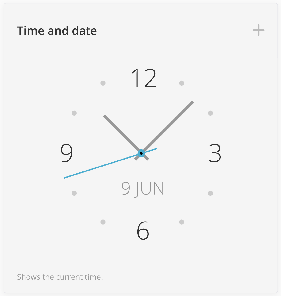 The Time and date widget shows the time and date according to the timezone chosen from the widget settings. Users can choose which type of clock will be shown on the widget - Analog or Digital. Also, in the widget settings, there is the ‘Include date’ toggle. After disabling this toggle, the date will not be displayed on the widget.