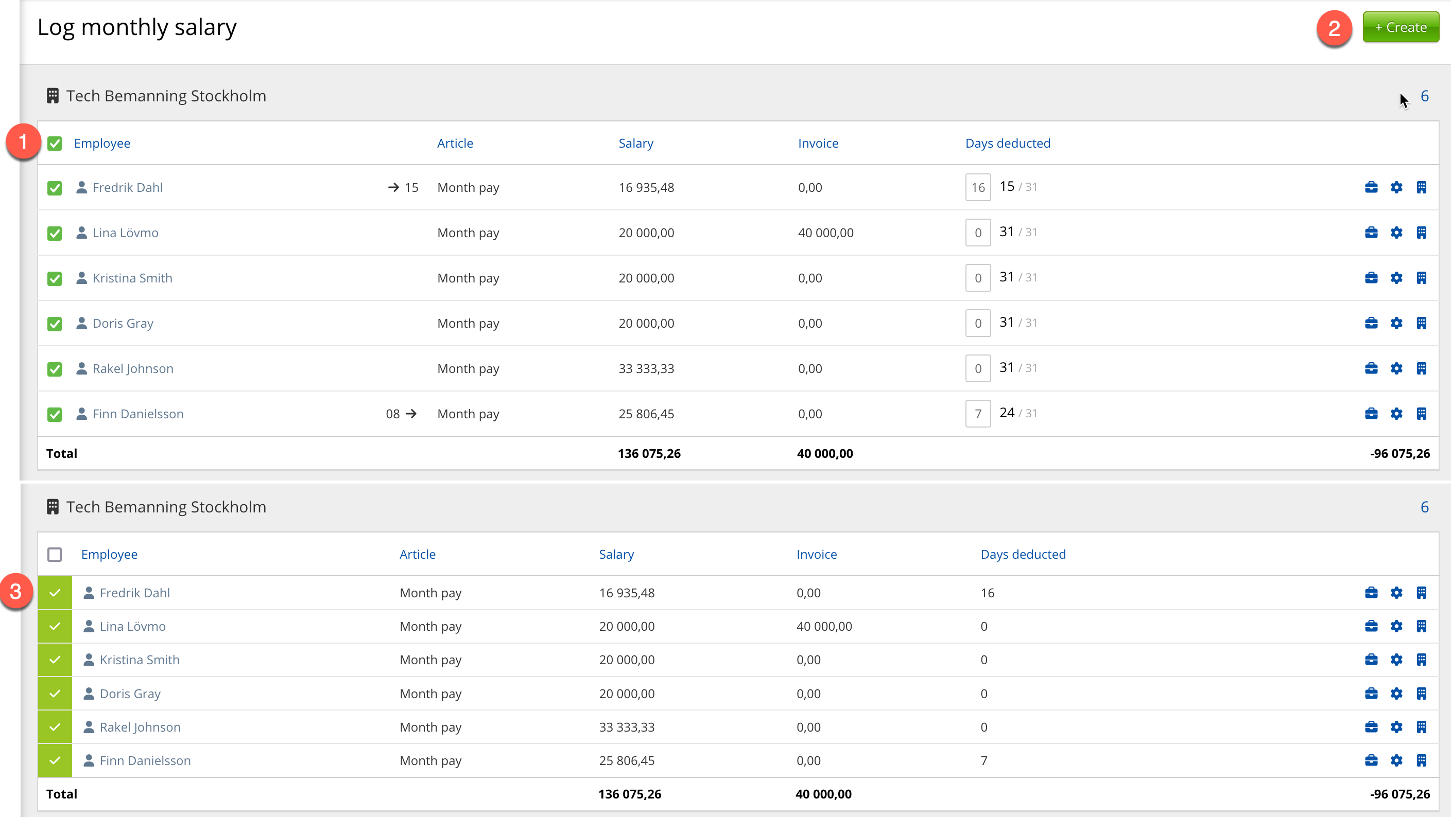 To log monthly salary, tick all or selected employees (1), and press Create (2). When created, they are marked with a solid green ticked box (3) and can no longer be edited from this module. It is possible to edit and remove the logged monthly salary by entering the Logged work module.