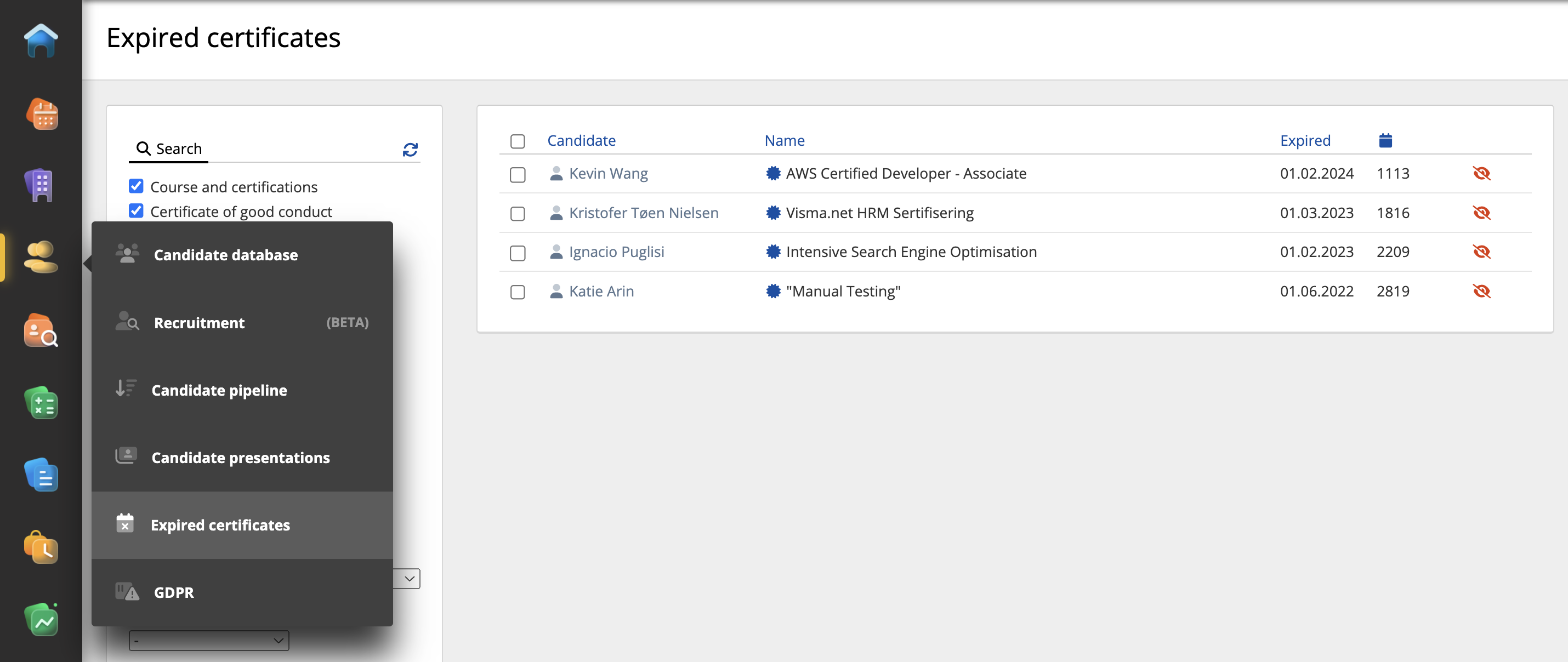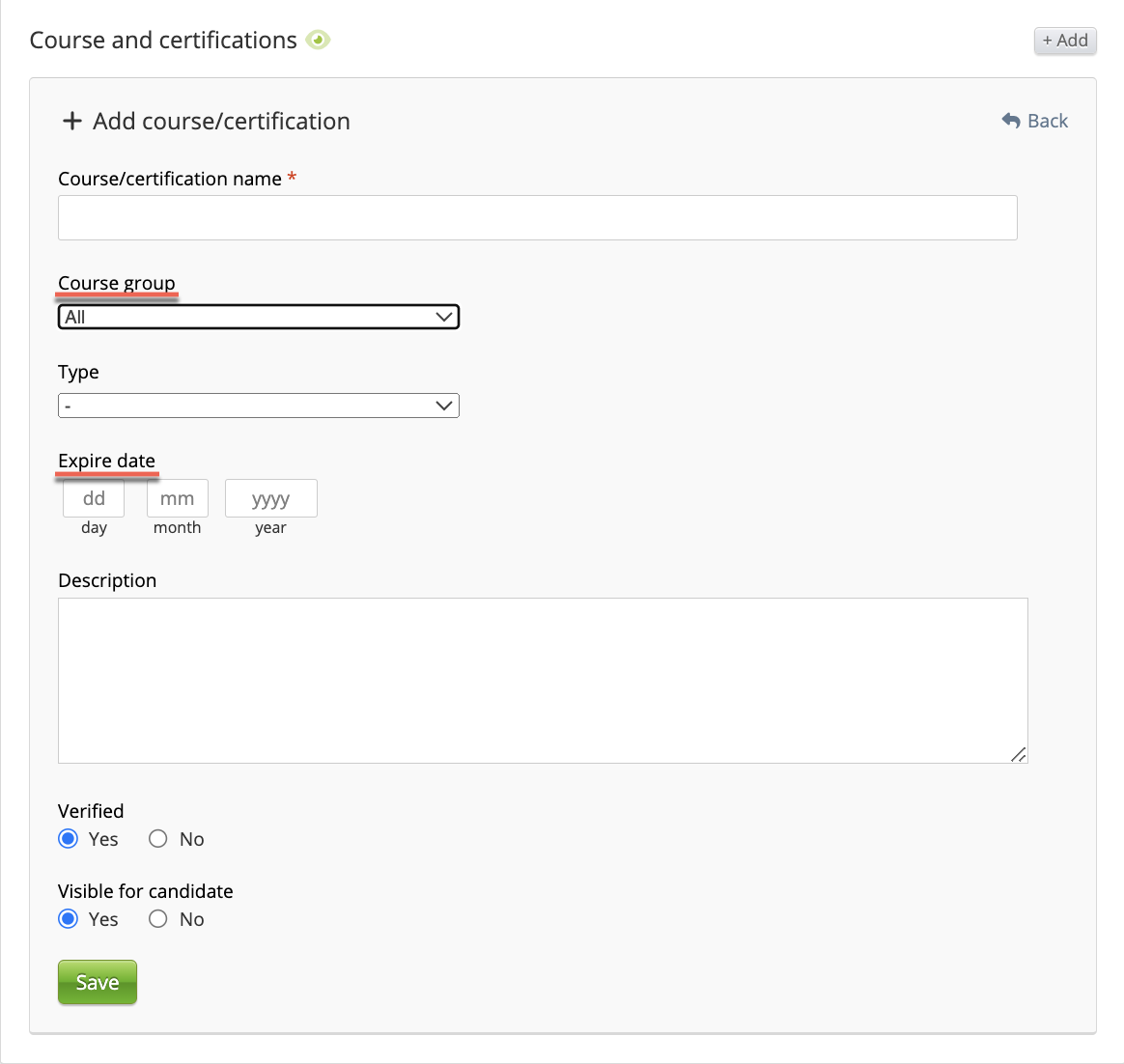 The user can set the Course group and Expired date from the Candidate page (Course and certifications section) in RecMan: