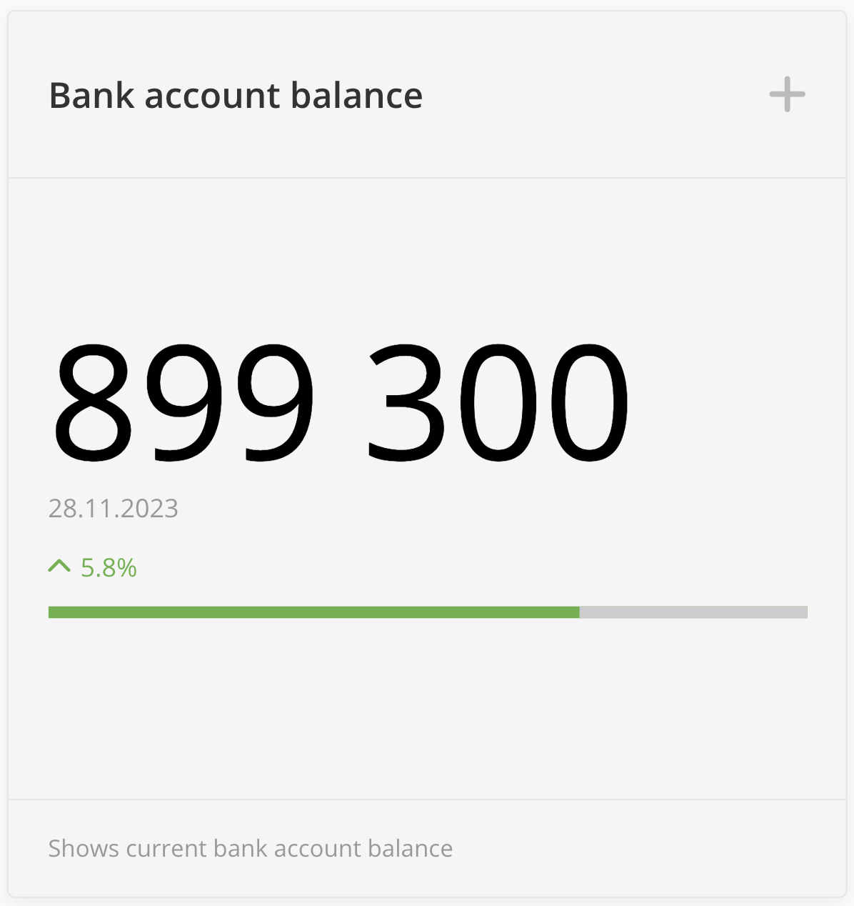 This widget shows the Total bank account/s balance/s, the current date of the bank account balance, and the balance change with the color bar. If at least two bank accounts are selected with different dates, in this case, the newest date will be shown on the widget as the "current date."