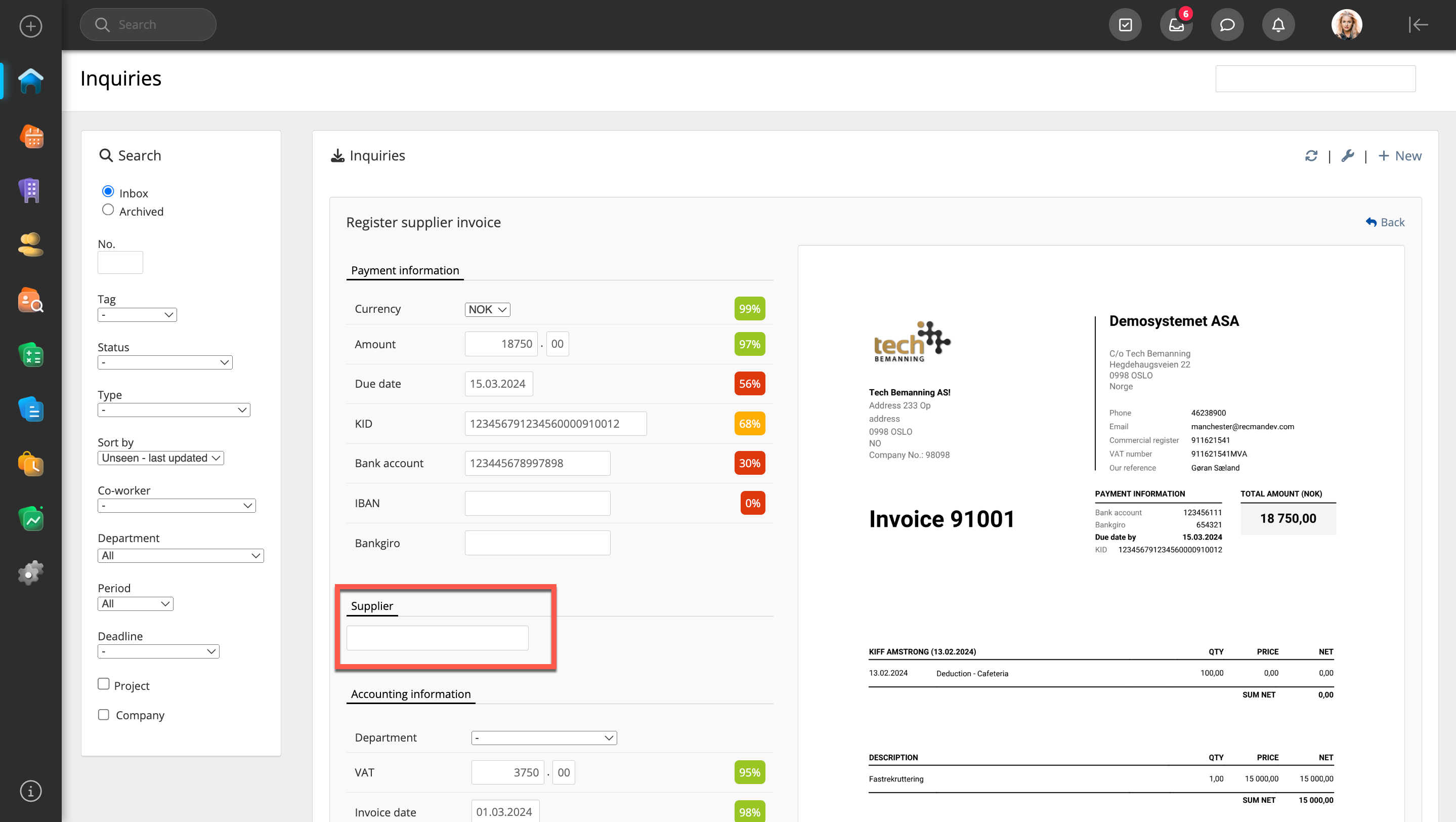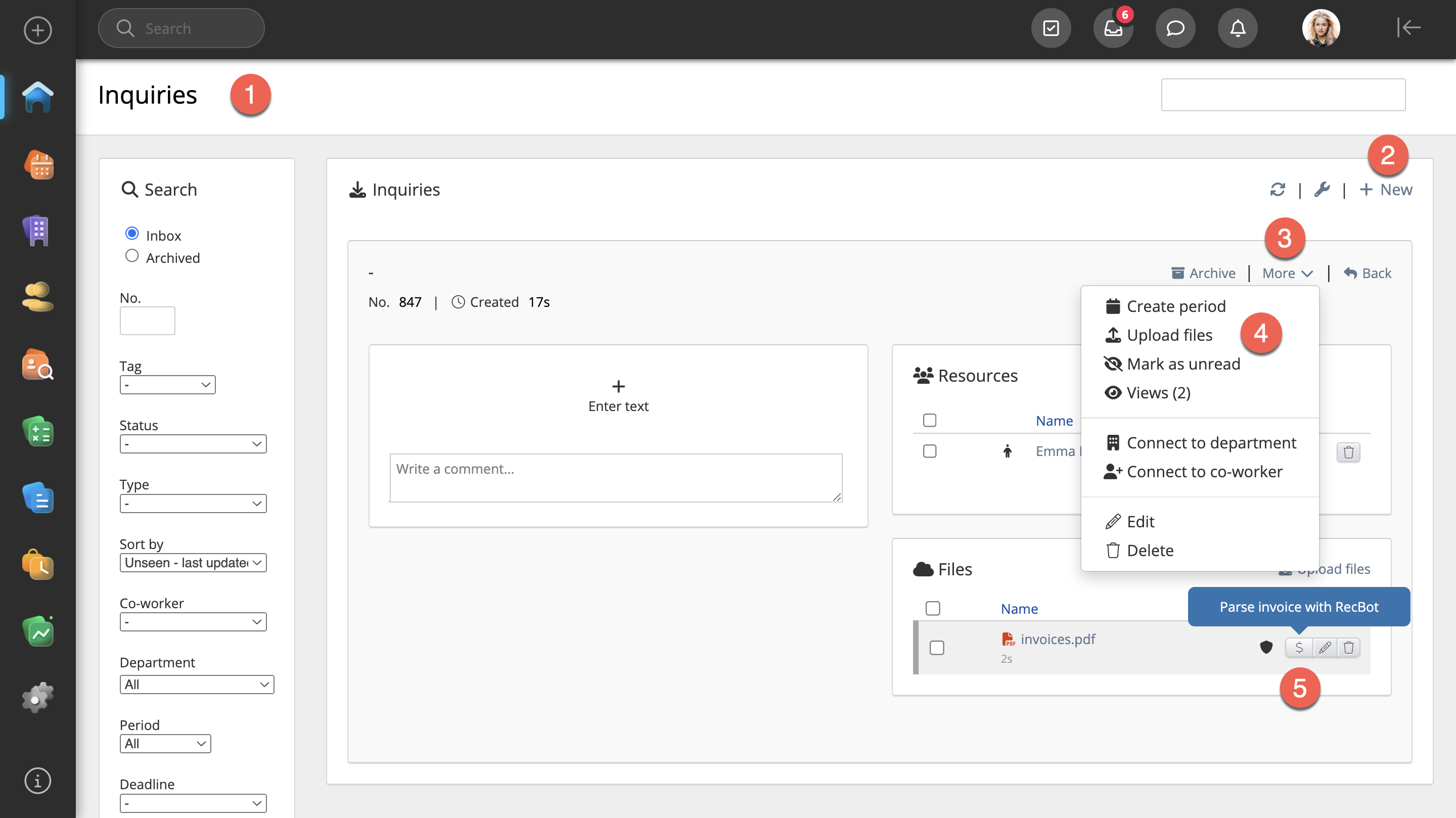 The user can set the Supplier invoice from the Inquiry module (Click New → More → Upload files → Select your invoice file → Parse invoice with RecBot).