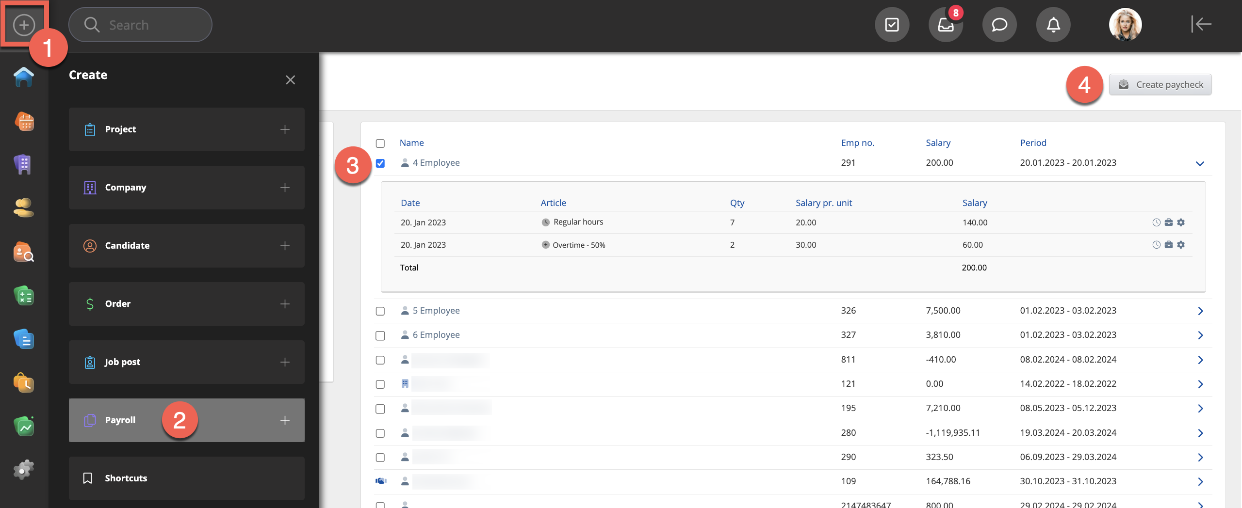 The user can set the employees' payroll from Payroll.