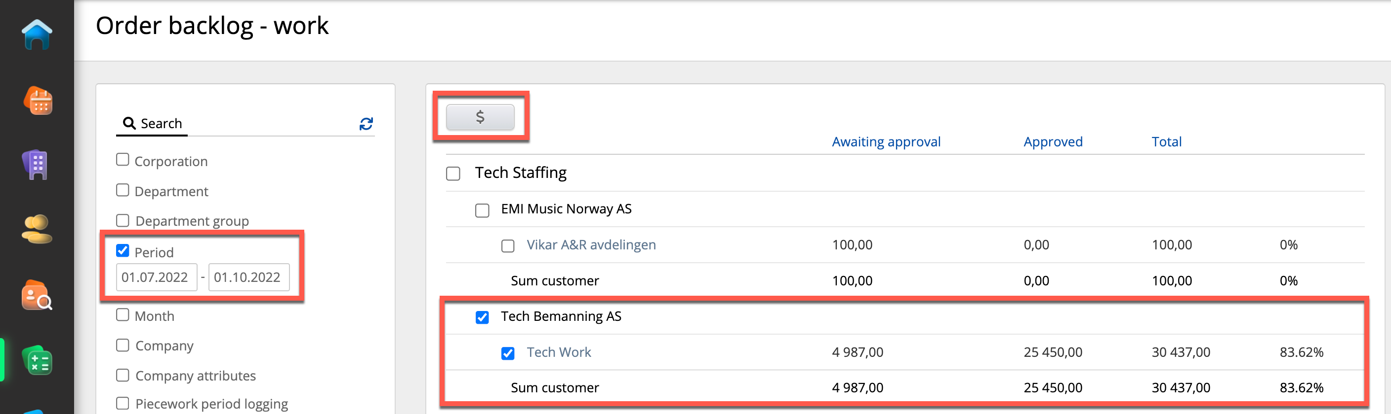 In Order backlog – work, you can apply a filter in order to view only the relevant hours, among other things, a period. In the example below, we see all work performed between 01.07.2022 and 01.10.2022.