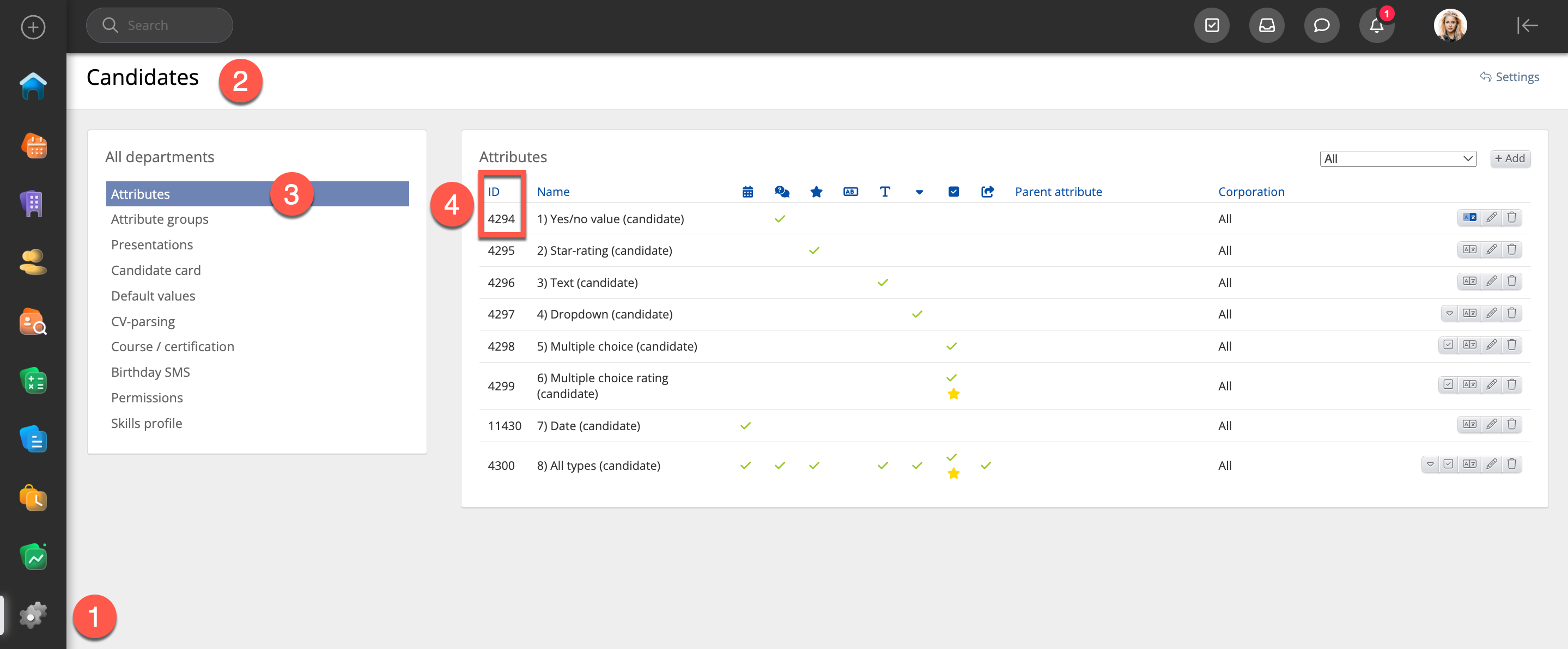 attribute ID: automatically created by the system when the attribute is added in the System Settings → Candidates, CRM or Projects → Attributes