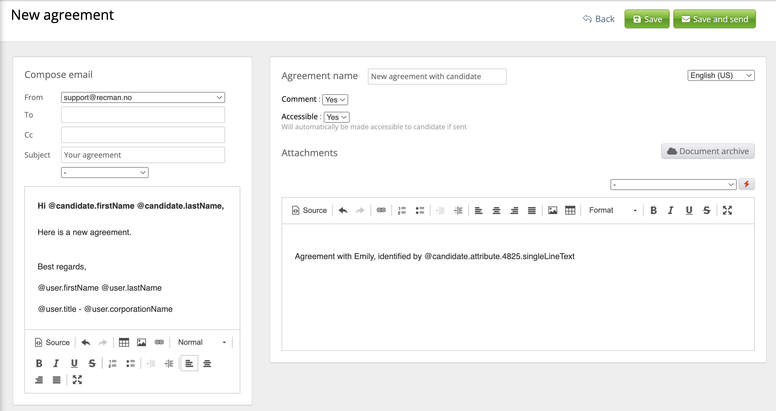 Merging attribute information can be used in numerous ways. For example, if you have a candidate attribute with a text field and you want to reference this in an agreement, you can simply fetch the information with the merge tag @candidate.attribute.XXX.text, and the text will be included in your agreement.