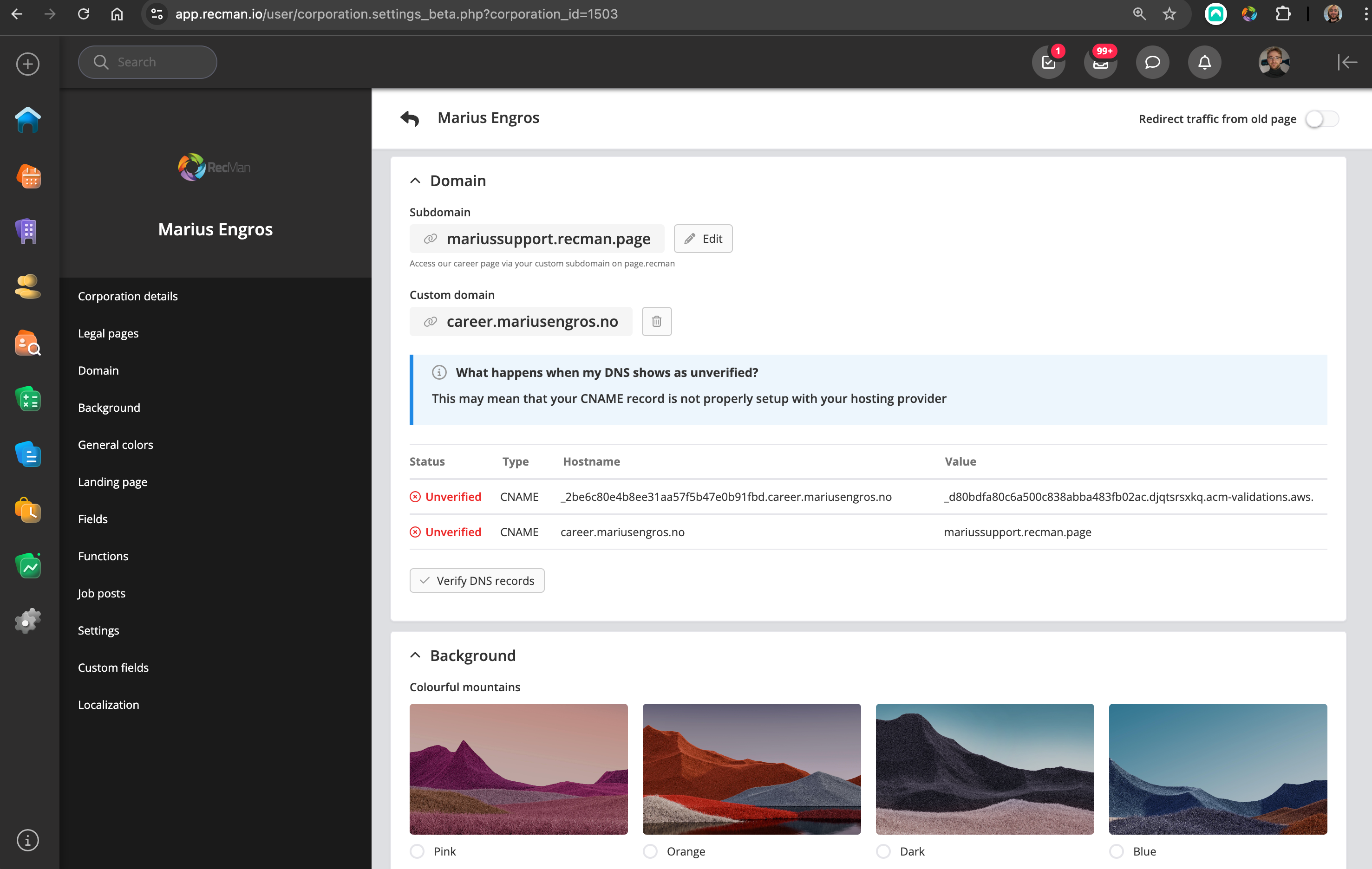 Setting up your RecMan Career page with a custom domain name is a great way of taking more ownership of the Career page, making it a natural extension to your website. Custom domains are most often set up as a subdomain, but it can also be configured as the root domain in case you don’t have a website.