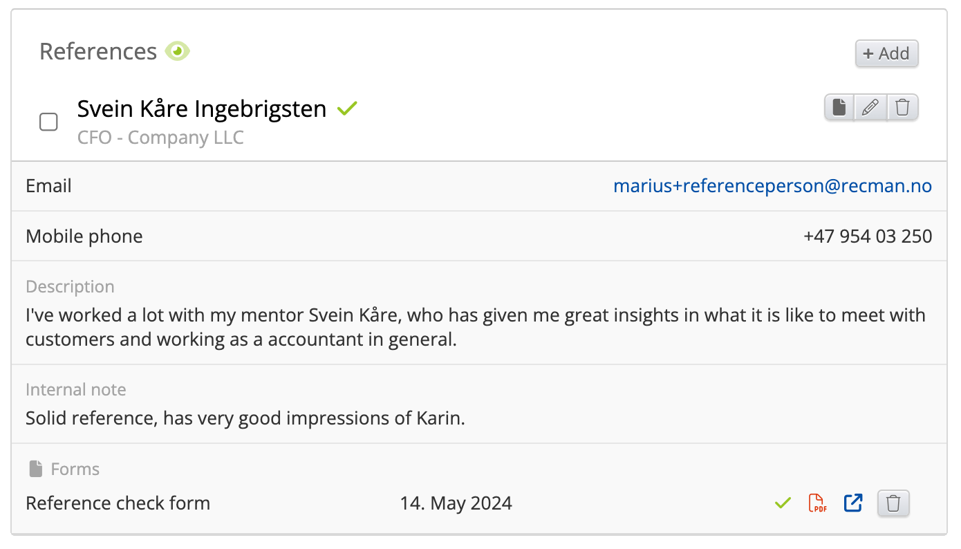 The information the candidate can add is name, title, what company they belong to, email and phone number. In addition, recruiters in the system can check a box to set the reference person as verified, candidates can add their description of the reference person, and the recruiter has an internal note for assessments they don’t want to disclose to the candidate.