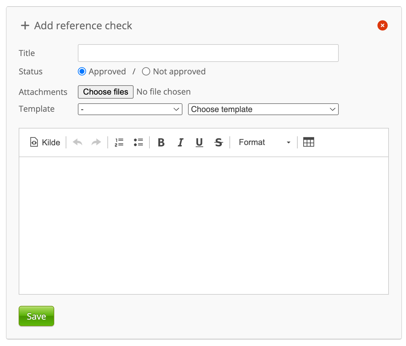 To register a completed reference check, navigate to the section for Reference check on the candidate card and click +Add. When registering, you can use the reference check as a note field, a summary of your conversation, or a more structured series of questions and answers.