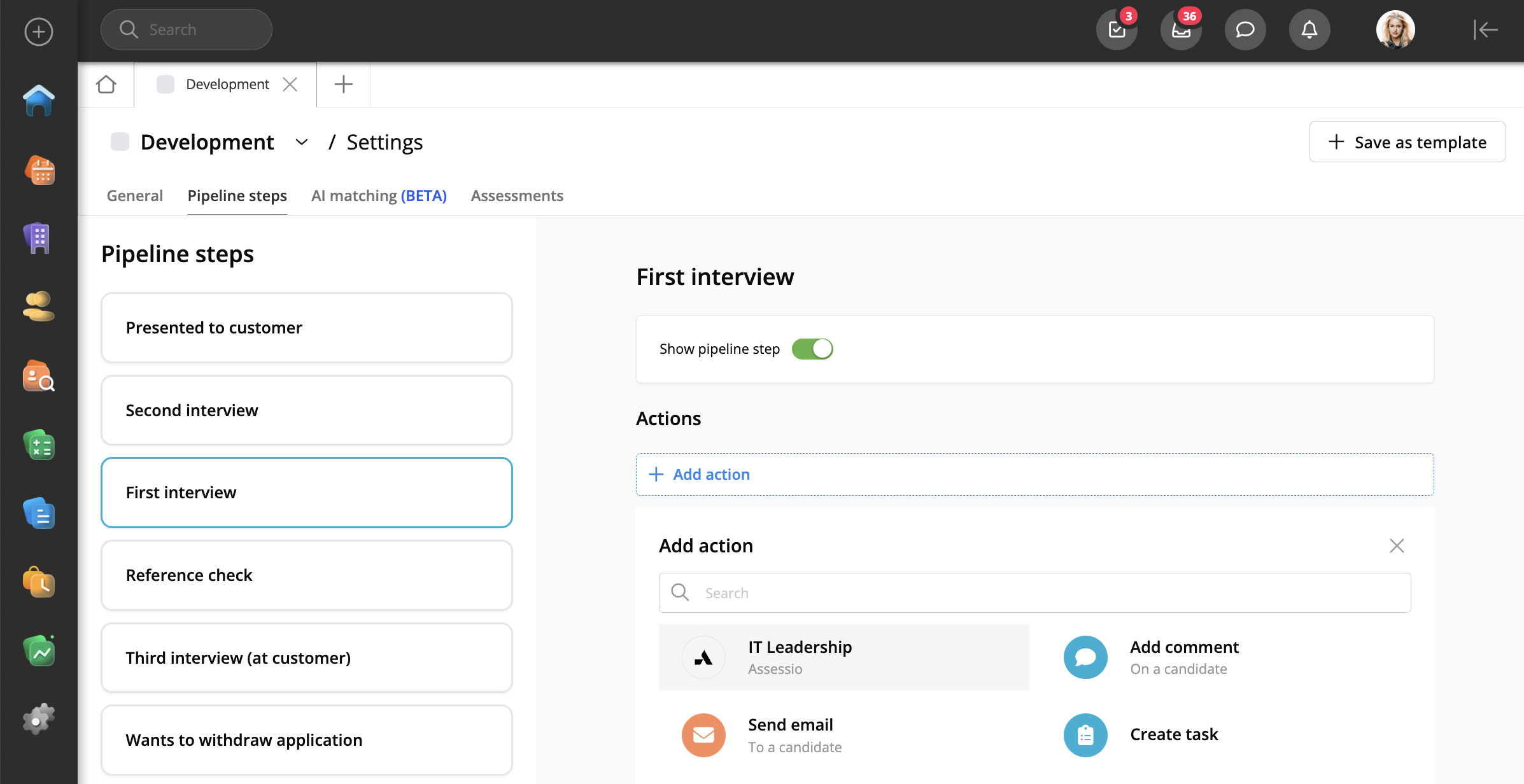 In the same Recruitment project settings, choose Pipeline steps. Then select the desired Assessio test for the chosen step. In the example below, we add the "IT Leadership" test to the First interview step in the Development project settings.
