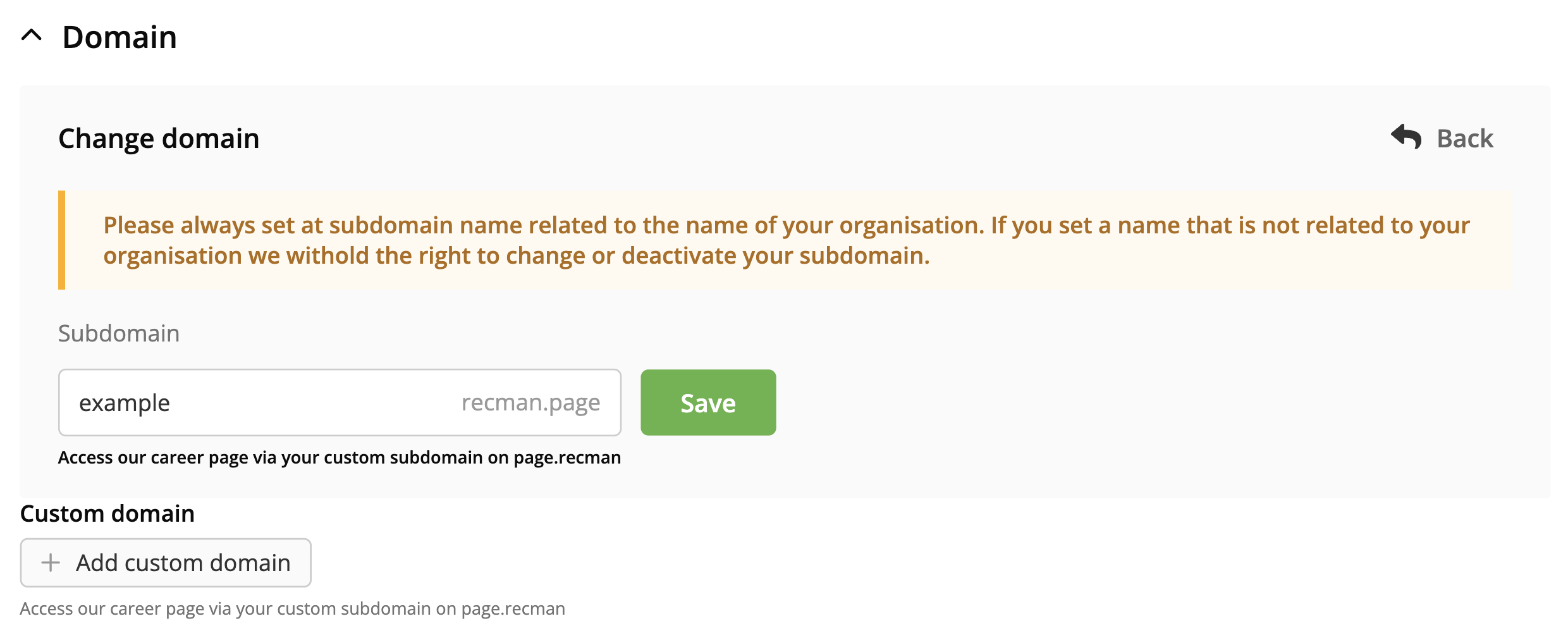 You can also set up a custom domain if you would like your candidate page to use your primary or root domain instead of RecMan’s domain name. Typically, if you own "company.com," you can set up your RecMan candidate page to be accessible for candidates as a subdomain such as "career.company.com."
