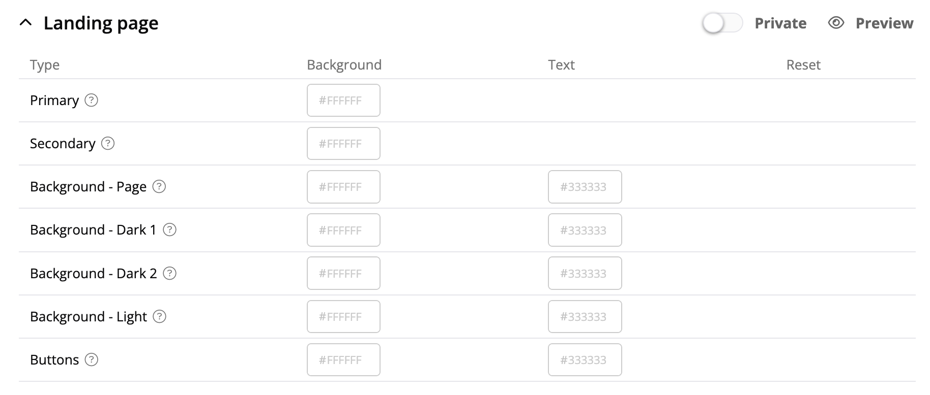 General and landing page colors